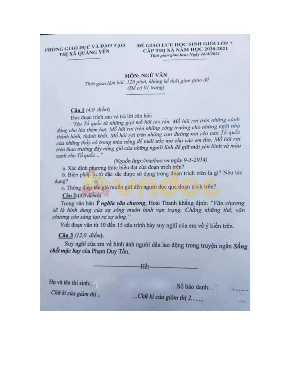 Đề thi học sinh giỏi môn Ngữ văn lớp 7 cấp thị xã năm 2020-2021 - Phòng GD&ĐT Quảng Yên