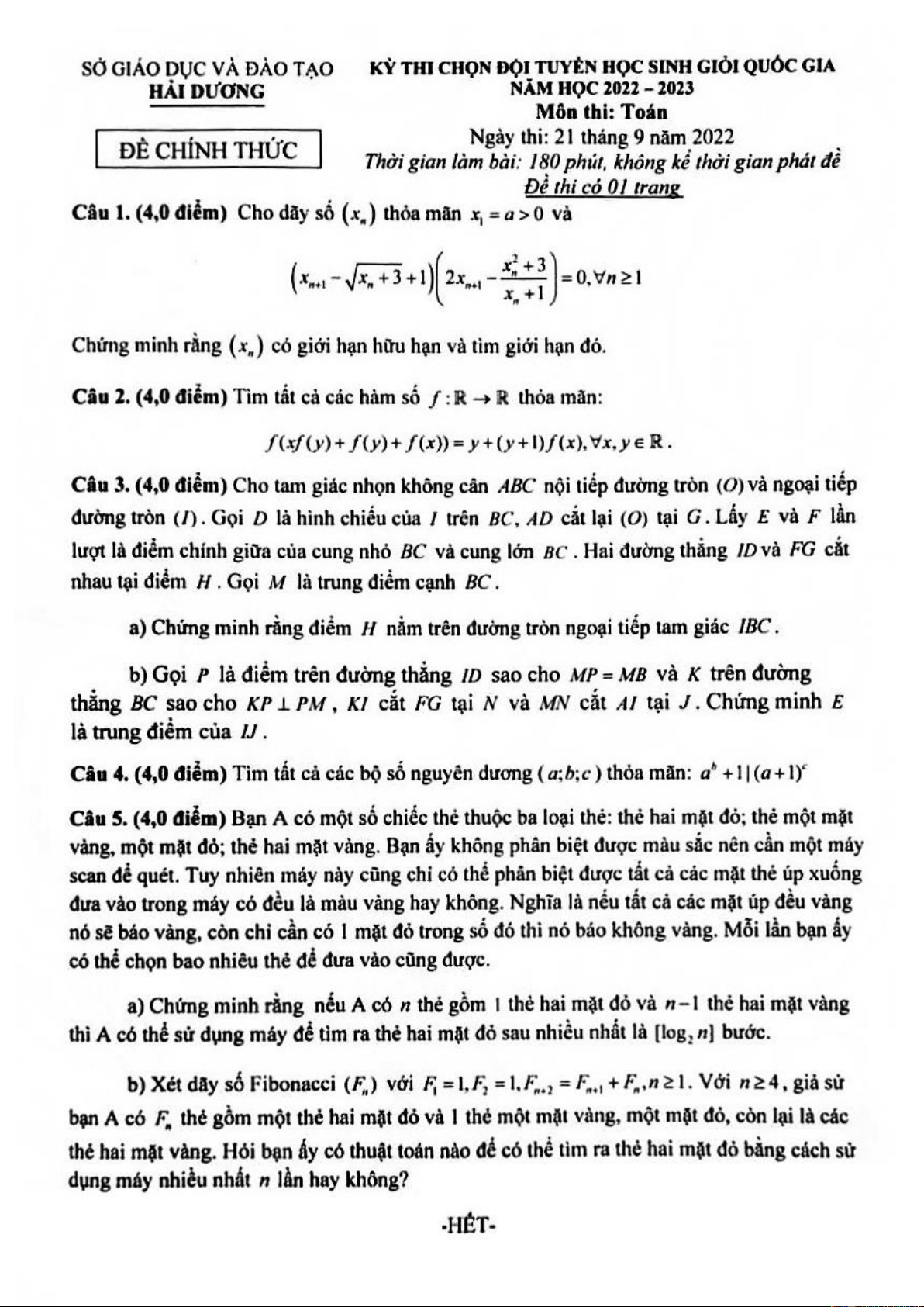 Đề thi chọn học sinh giỏi Quốc gia môn Toán năm 2022-2023 - Sở GD&ĐT Hải Dương