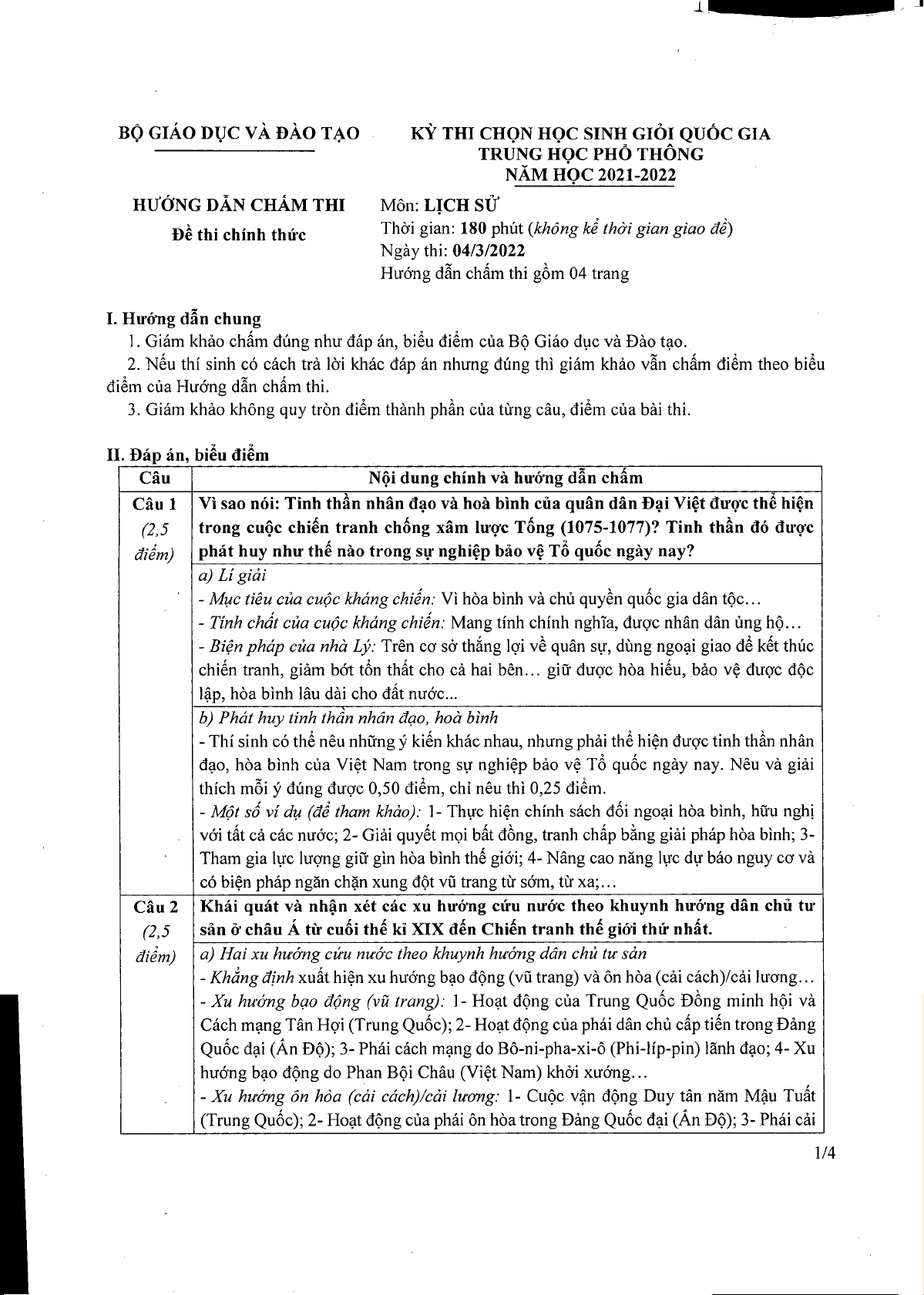Đề thi học sinh giỏi Quốc gia THPT môn Lịch sử năm học 2021-2022 có đáp án - Bộ Giáo dục và Đào tạo