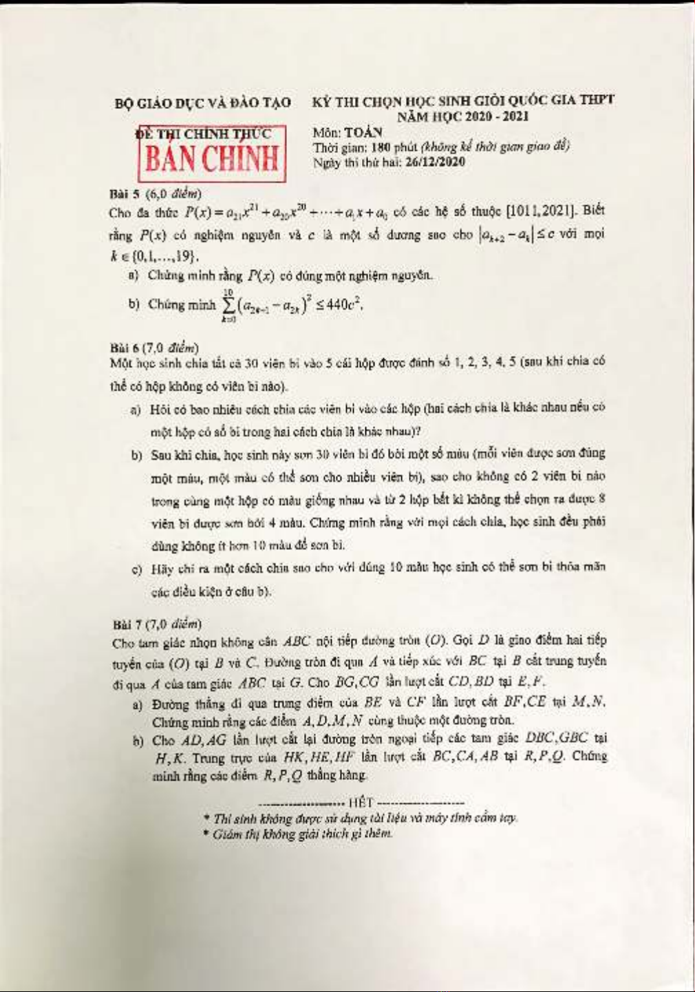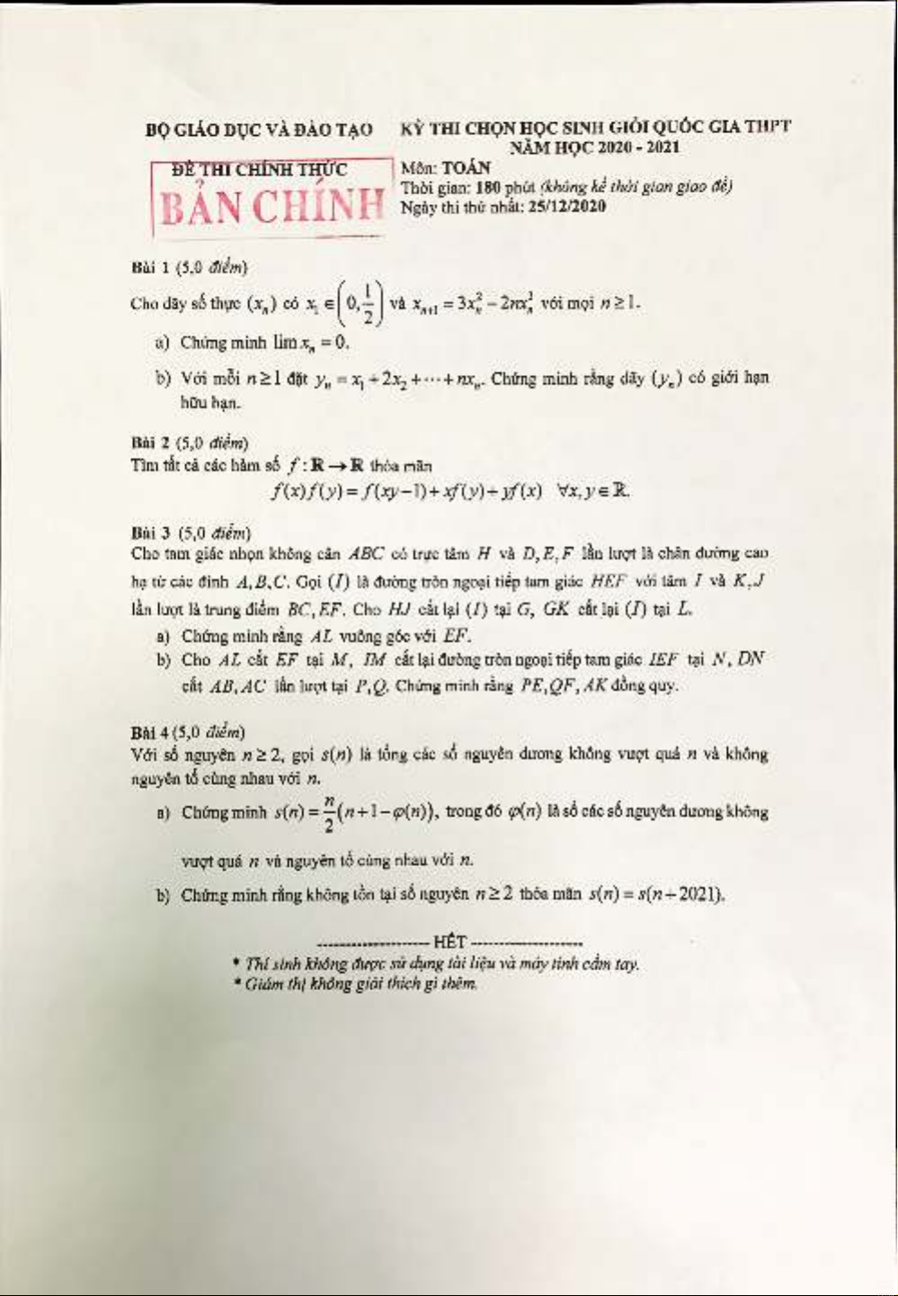 Đề thi học sinh giỏi Quốc gia THPT môn Toán năm 2020-2021 - Bộ GD&ĐT