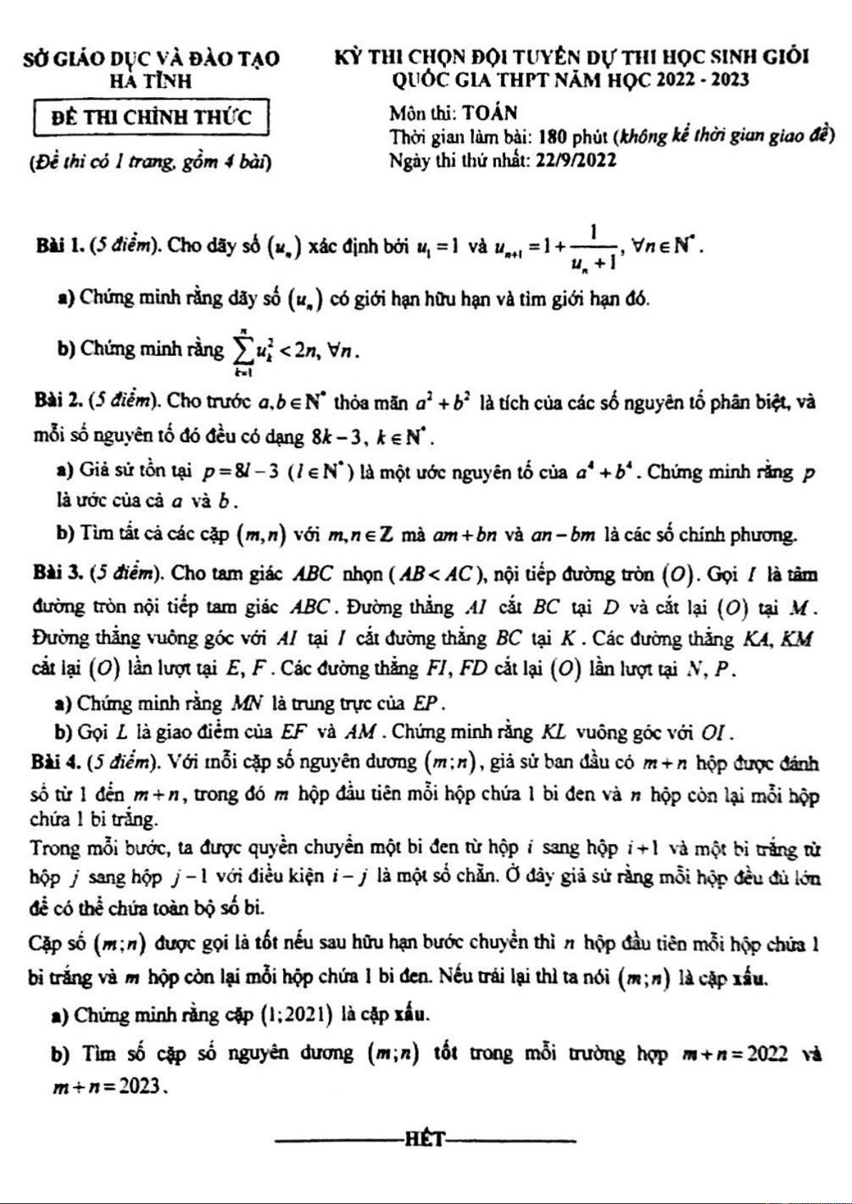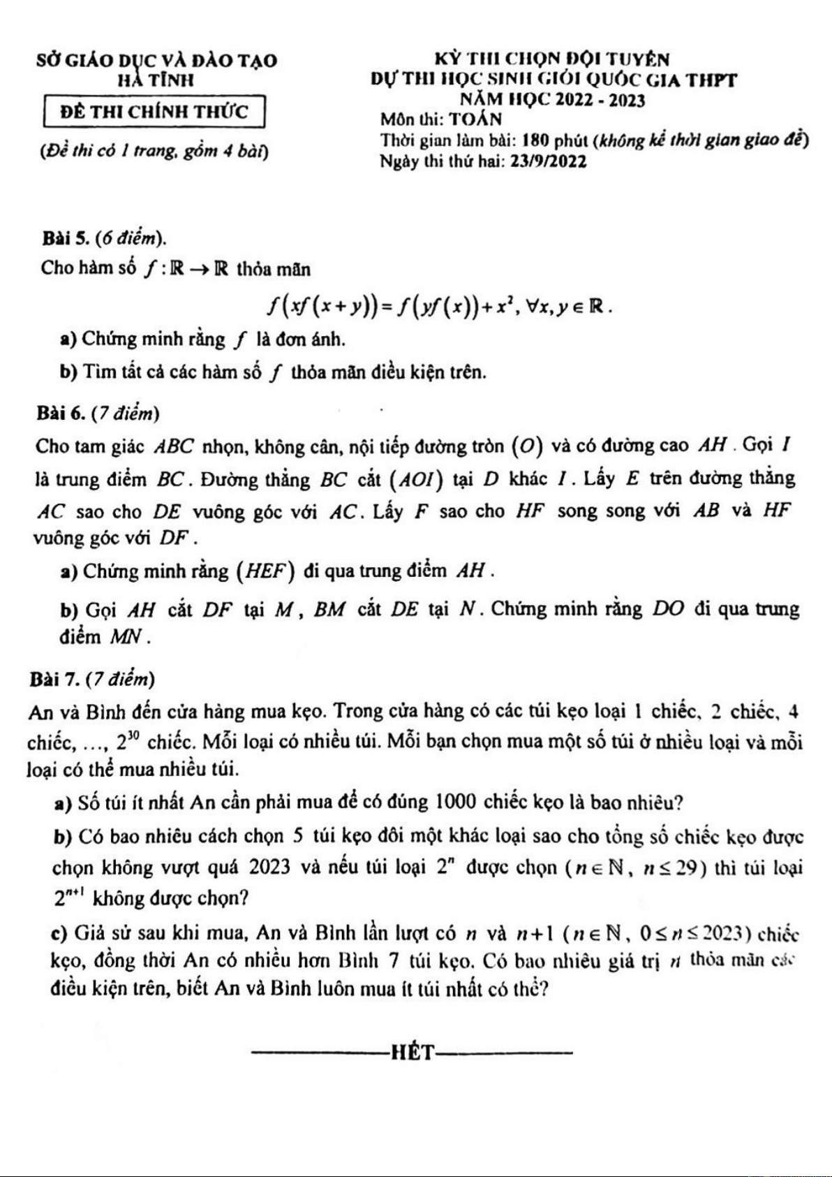 Đề thi chọn học sinh giỏi Quốc gia môn Toán năm 2022-2023 - Sở GD&ĐT Hà Tĩnh