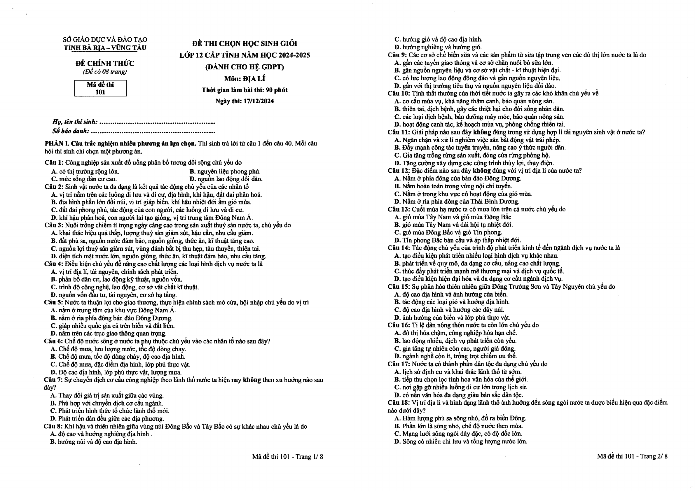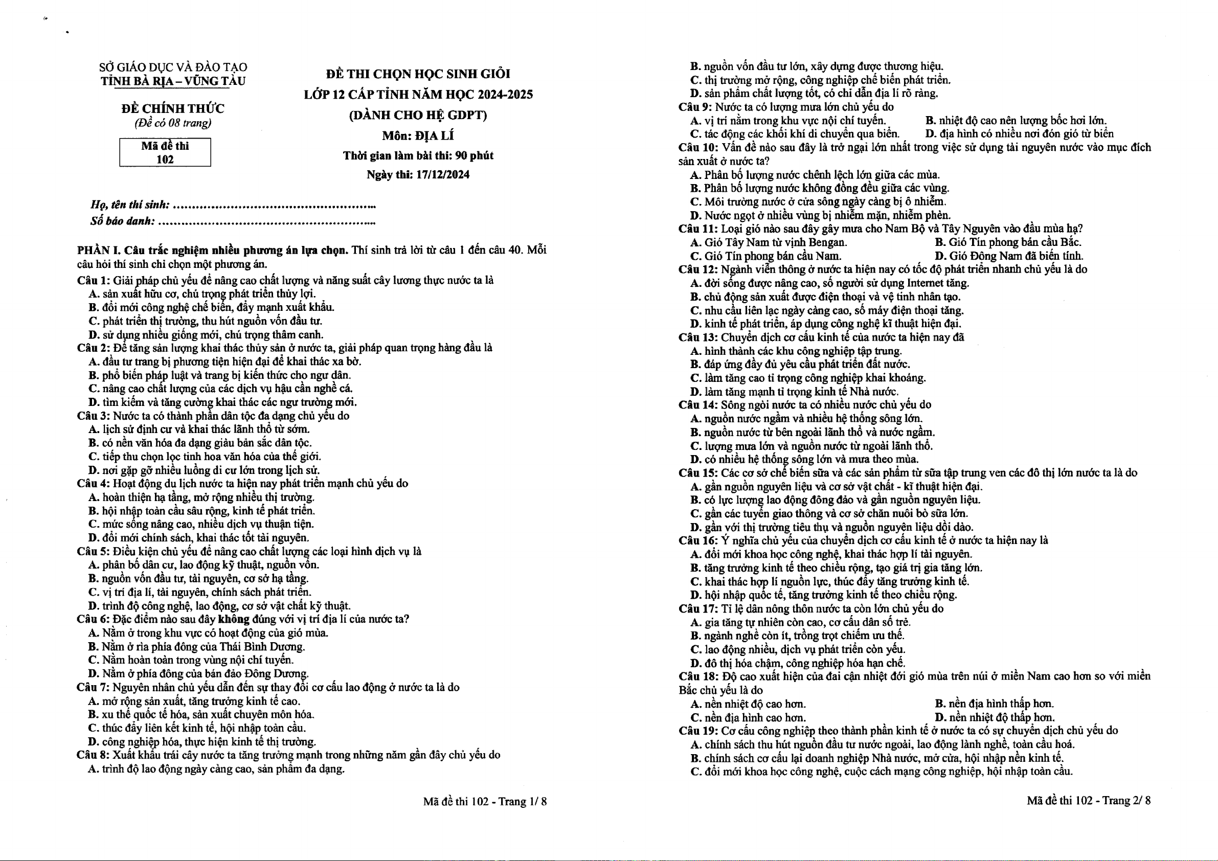 Tài liệu này là đề thi chính thức môn Địa lí dành cho học sinh giỏi lớp 12 cấp Tỉnh năm học 2024-2025 tại Bà Rịa – Vũng Tàu. Mục đích chính của đề thi là đánh giá toàn diện kiến thức và kỹ năng địa lí của học sinh, bao gồm cả địa lí tự nhiên và địa lí kinh tế – xã hội Việt Nam. Đề thi không chỉ kiểm tra khả năng ghi nhớ mà còn chú trọng đến tư duy phân tích, tổng hợp thông qua các câu hỏi trắc nghiệm nhiều lựa chọn và trả lời ngắn. Việc đánh giá này có vai trò quan trọng trong việc tuyển chọn và bồi dưỡng những tài năng địa lí trẻ, góp phần nâng cao chất lượng giáo dục Địa lí THPT.