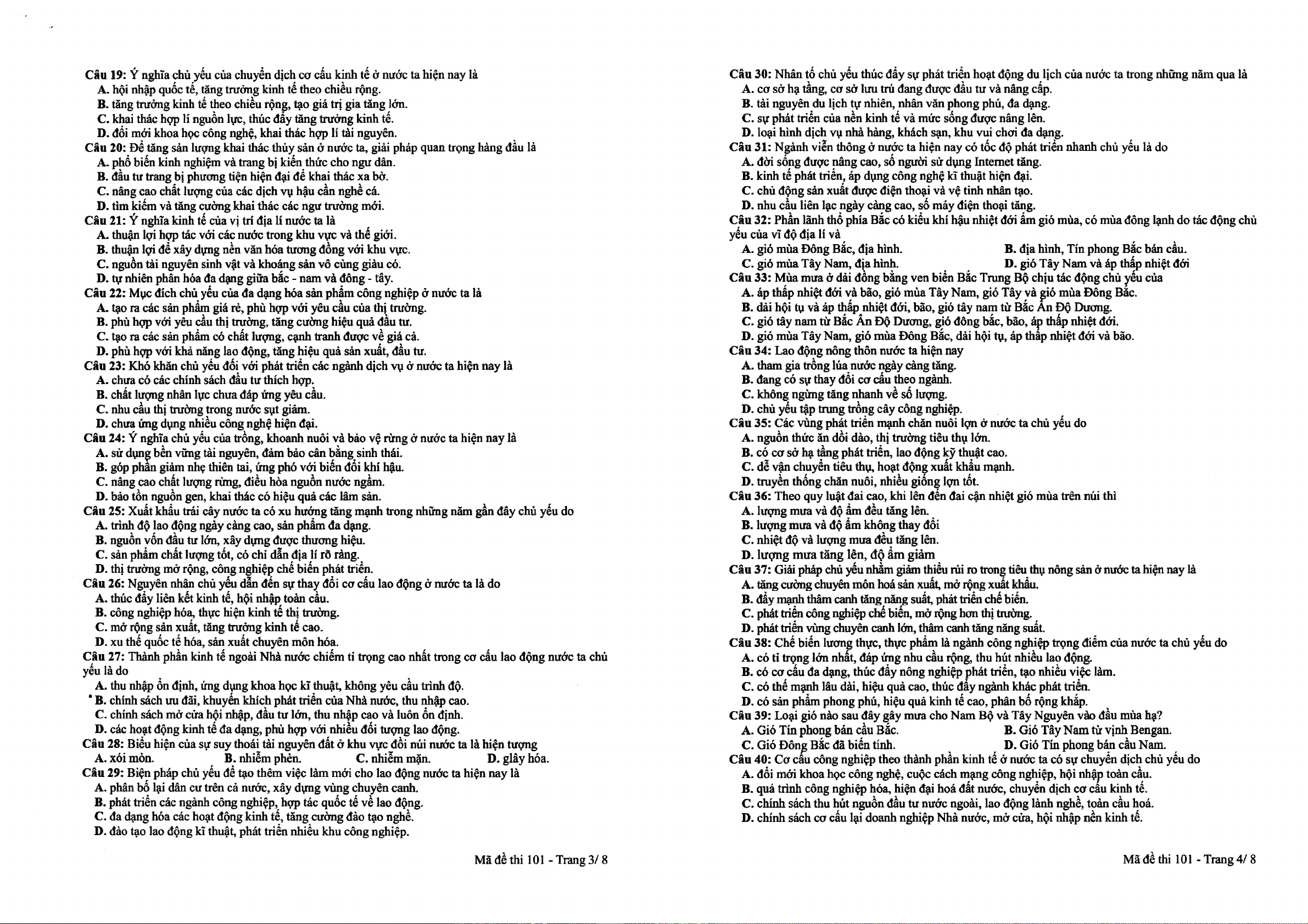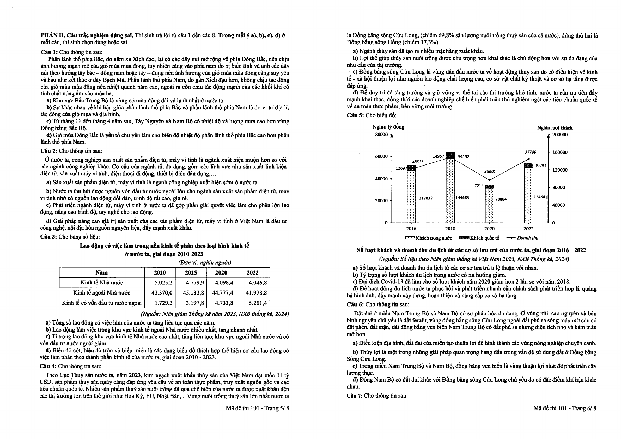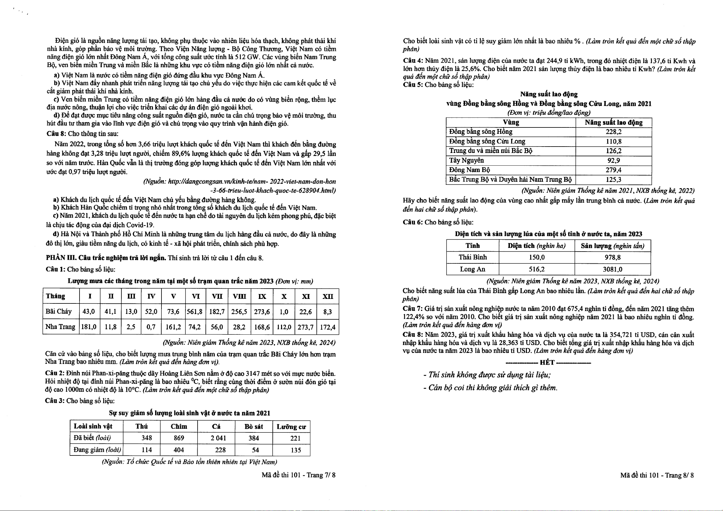 Đề thi bao gồm hai phần chính: trắc nghiệm nhiều phương án lựa chọn (40 câu) và trắc nghiệm đúng sai (8 câu), cùng với một phần câu hỏi trả lời ngắn (8 câu), được thiết kế để đánh giá sâu rộng kiến thức Địa lí. Nội dung bao quát các khía cạnh đa dạng của địa lí Việt Nam, từ địa lí tự nhiên như khí hậu, sông ngòi, thổ nhưỡng, sinh vật, đến địa lí kinh tế – xã hội như dân số, lao động, các ngành kinh tế (công nghiệp, nông nghiệp, dịch vụ, du lịch), cơ cấu kinh tế, và các vấn đề môi trường. Các câu hỏi đòi hỏi học sinh vận dụng kiến thức về các đặc điểm tự nhiên, kinh tế – xã hội của Việt Nam, các quy luật địa lí cơ bản, và khả năng phân tích biểu đồ, bảng số liệu. Phương pháp đánh giá kết hợp giữa kiểm tra kiến thức định tính và định lượng, giúp nhận định khách quan năng lực học sinh. Giá trị ứng dụng của đề thi nằm ở việc cung cấp một công cụ đánh giá chuẩn xác cho công tác tuyển chọn và phân loại học sinh giỏi, đồng thời phản ánh hiệu quả của chương trình giảng dạy Địa lí ở bậc THPT. Thông qua kết quả thi, nhà trường và các cơ quan quản lý giáo dục có thể nhìn nhận các điểm mạnh, điểm yếu trong việc học và dạy môn Địa lí, từ đó đưa ra các điều chỉnh phù hợp để nâng cao chất lượng đào tạo và phát triển bền vững nguồn nhân lực địa lí.