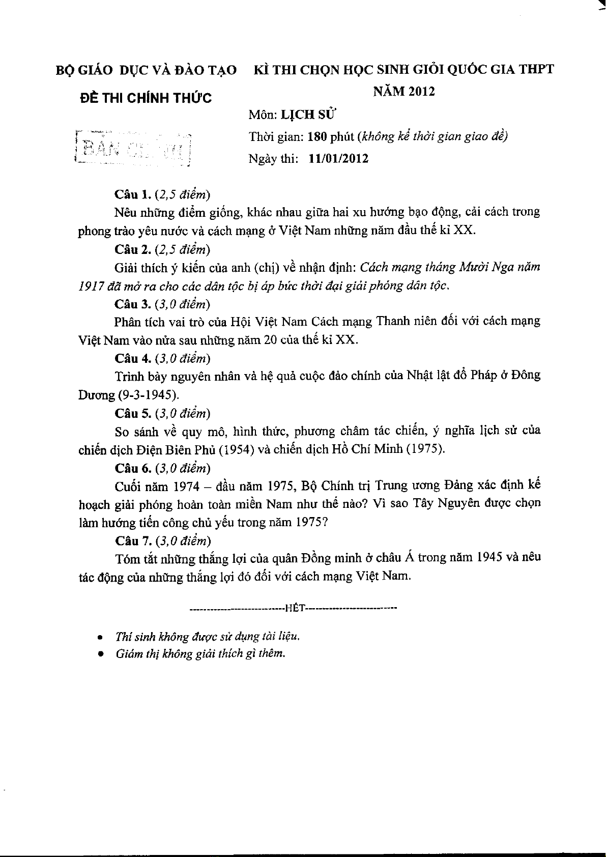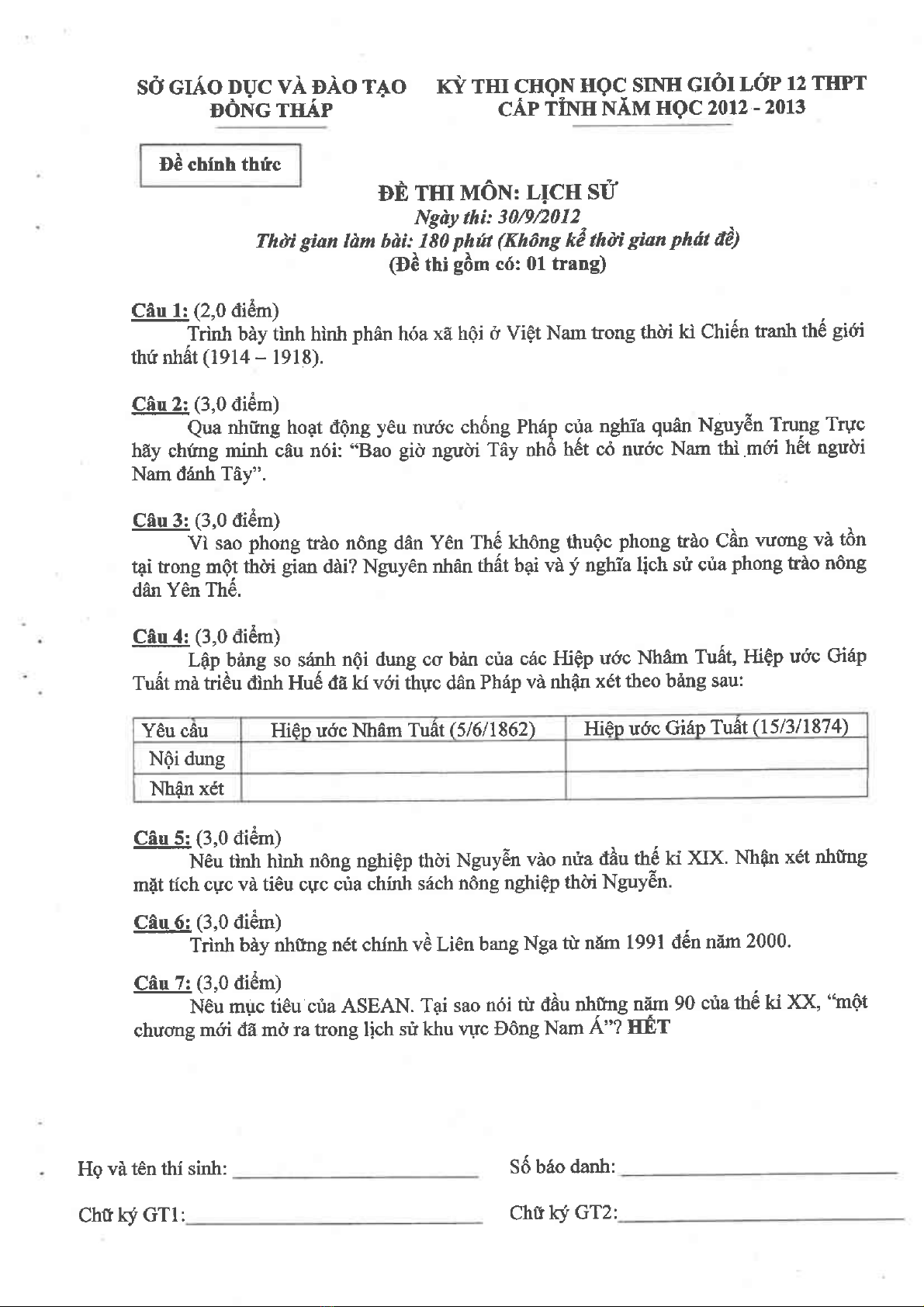 ĐỀ CHÍNH THỨC Môn: Lịch sử - THCS