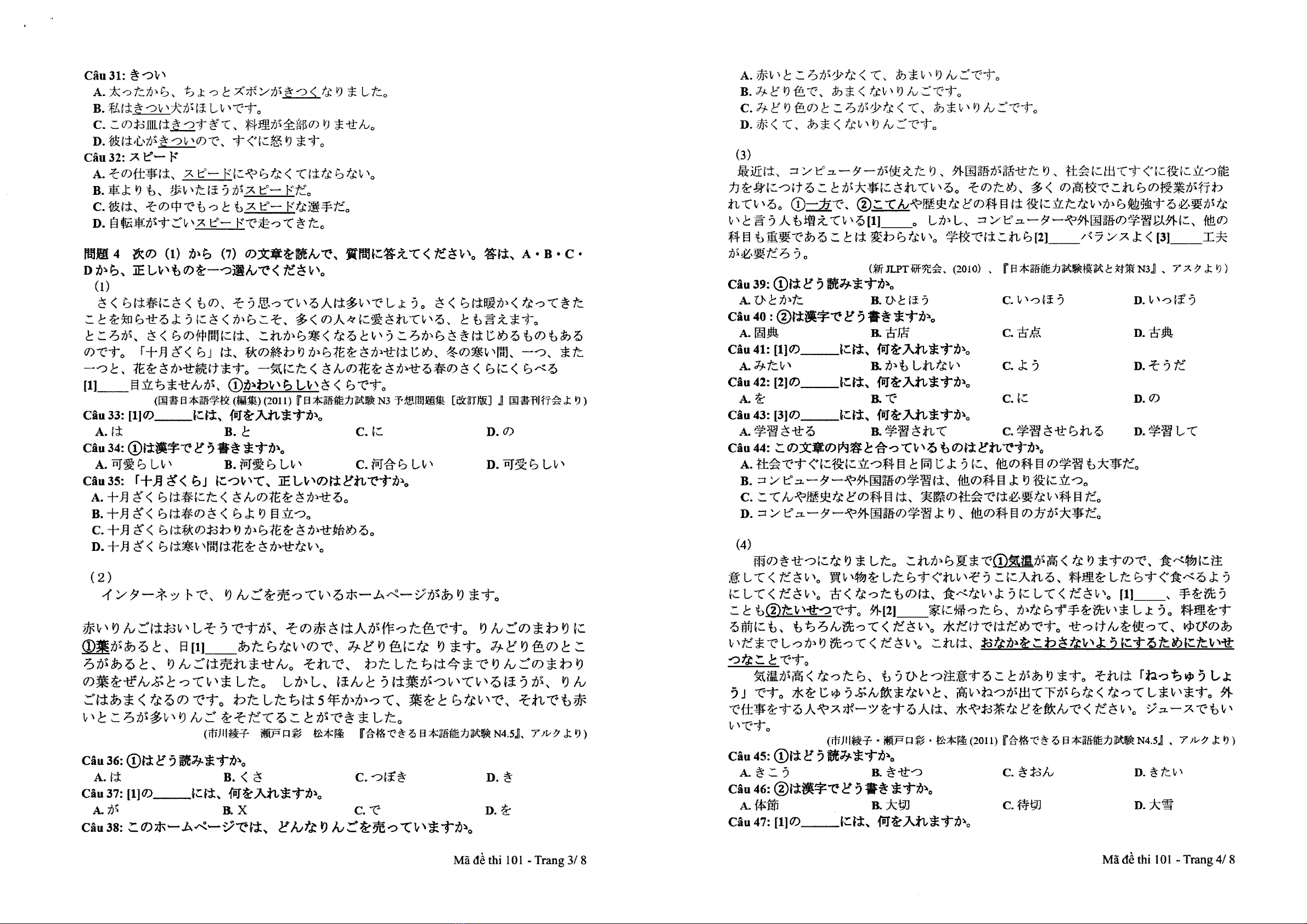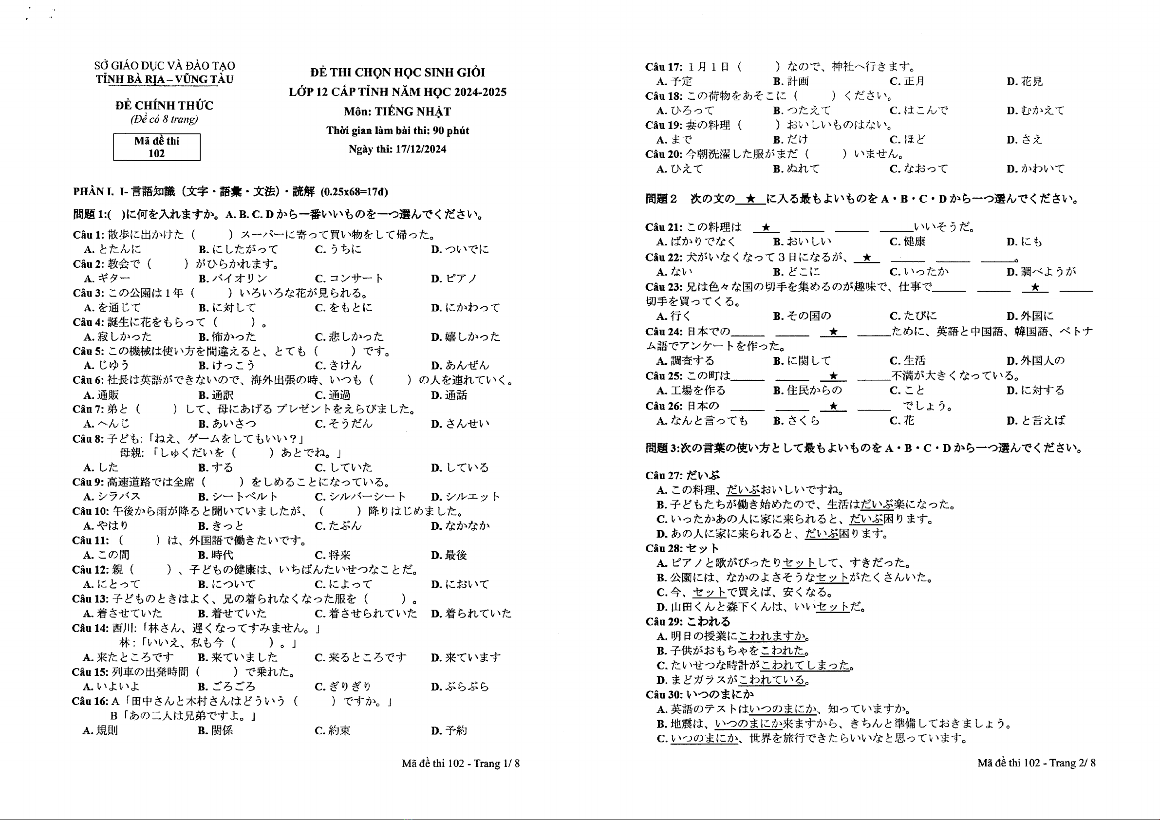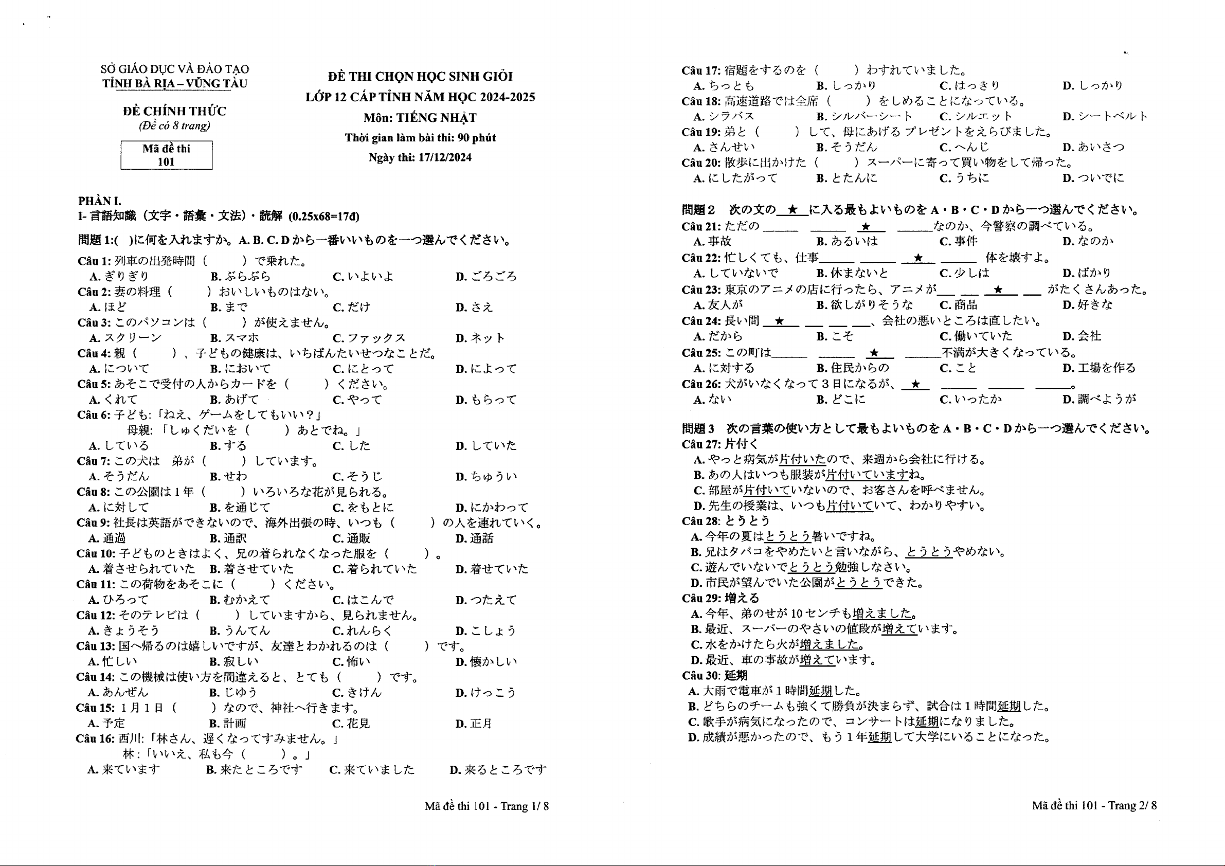 Đề thi học sinh giỏi cấp tỉnh môn Tiếng Nhật lớp 12 năm 2024-2025 do Sở GD&ĐT Bà Rịa - Vũng Tàu phát hành. Đề thi bao gồm các phần khác nhau, mỗi phần có chứa câu hỏi về ngữ âm, ngữ pháp, đọc hiểu và viết trả lời. Phần I là phần ngữ âm, yêu cầu thí sinh phát âm, ngữ điệu, ngữ nghĩa. Phần II là phần ngữ pháp, yêu cầu cấu trúc câu, động từ và danh từ. Phần III là phần đọc hiểu, có nhiều đoạn văn bản về các chủ đề khác nhau, bao gồm cuộc sống hàng ngày, văn hóa Nhật Bản, kinh tế. Phần IV là phần viết trả lời, yêu cầu thí sinh viết một bài luận ngắn về một chủ đề được cung cấp. Đề thi có thời gian làm bài 120 phút và được chấm theo thang điểm 0-10. Tham khảo nội dung chi tiết sẽ giúp các thí sinh tự luận hơn về kiến thức, phát triển kỹ năng ngôn ngữ trước kỳ thi.
