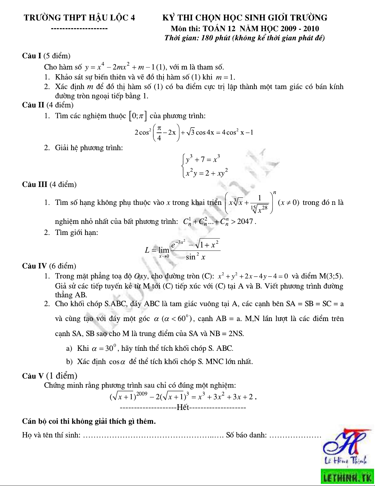 (Thời gian làm bài 180’)