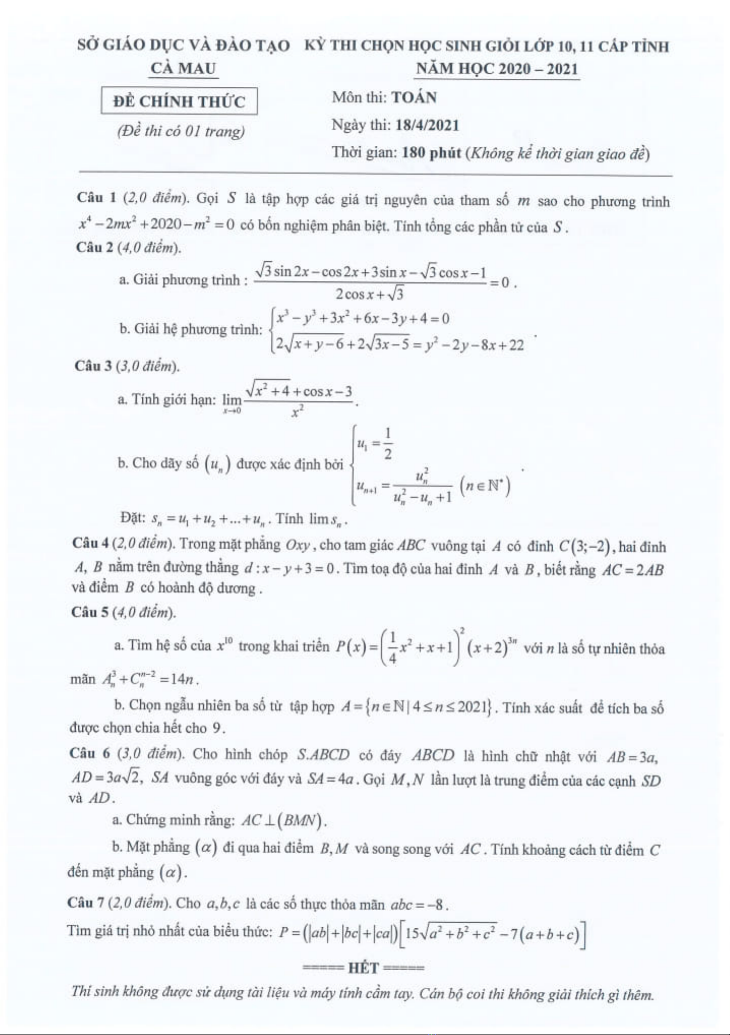 Đề thi học sinh giỏi môn Toán lớp 11 cấp tỉnh năm 2020-2021 - Sở GD&ĐT Cà Mau