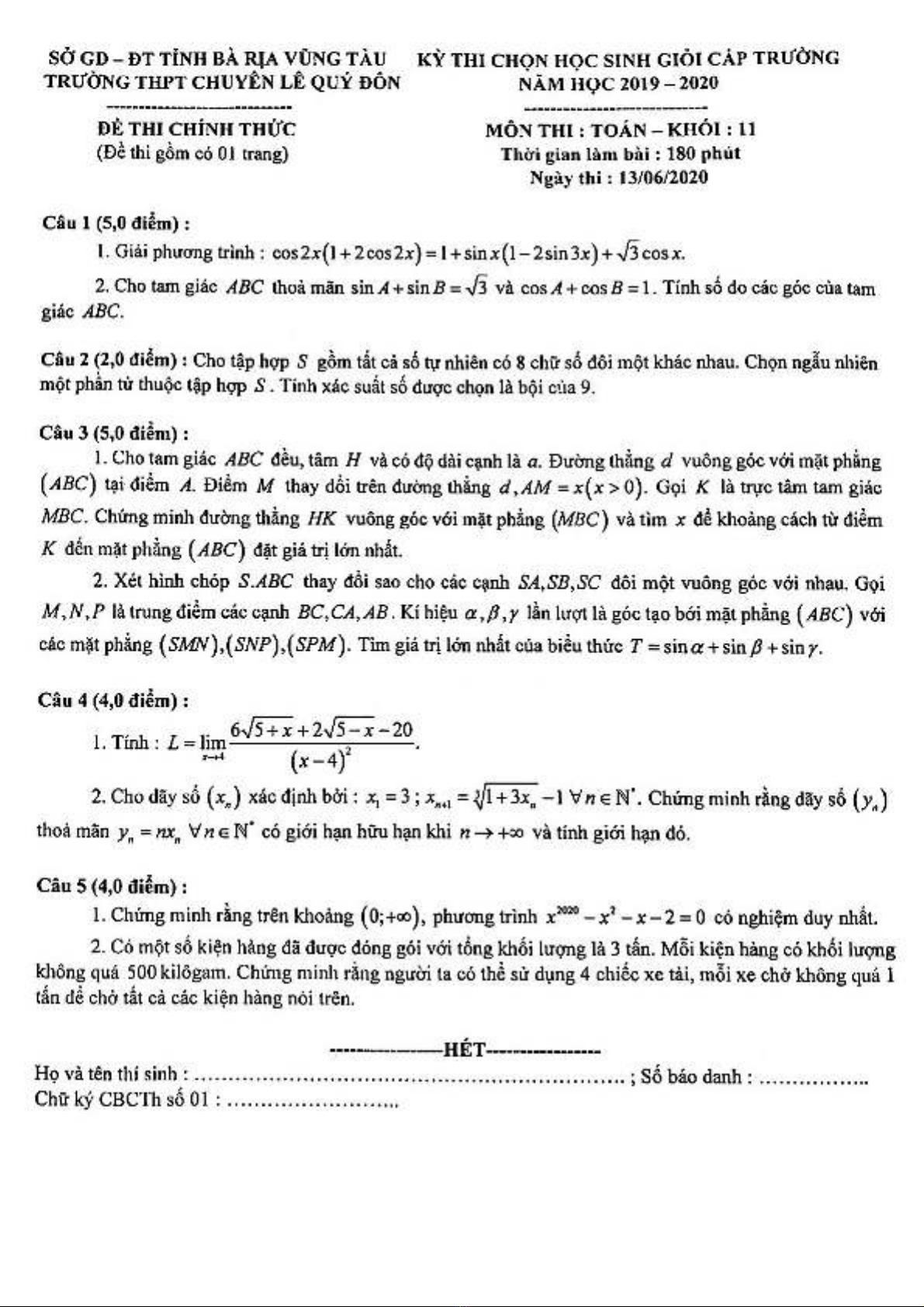 Đề thi học sinh giỏi môn Toán lớp 11 cấp trường năm 2019-2020 - Trường THPT Chuyên Lê Quý Đôn