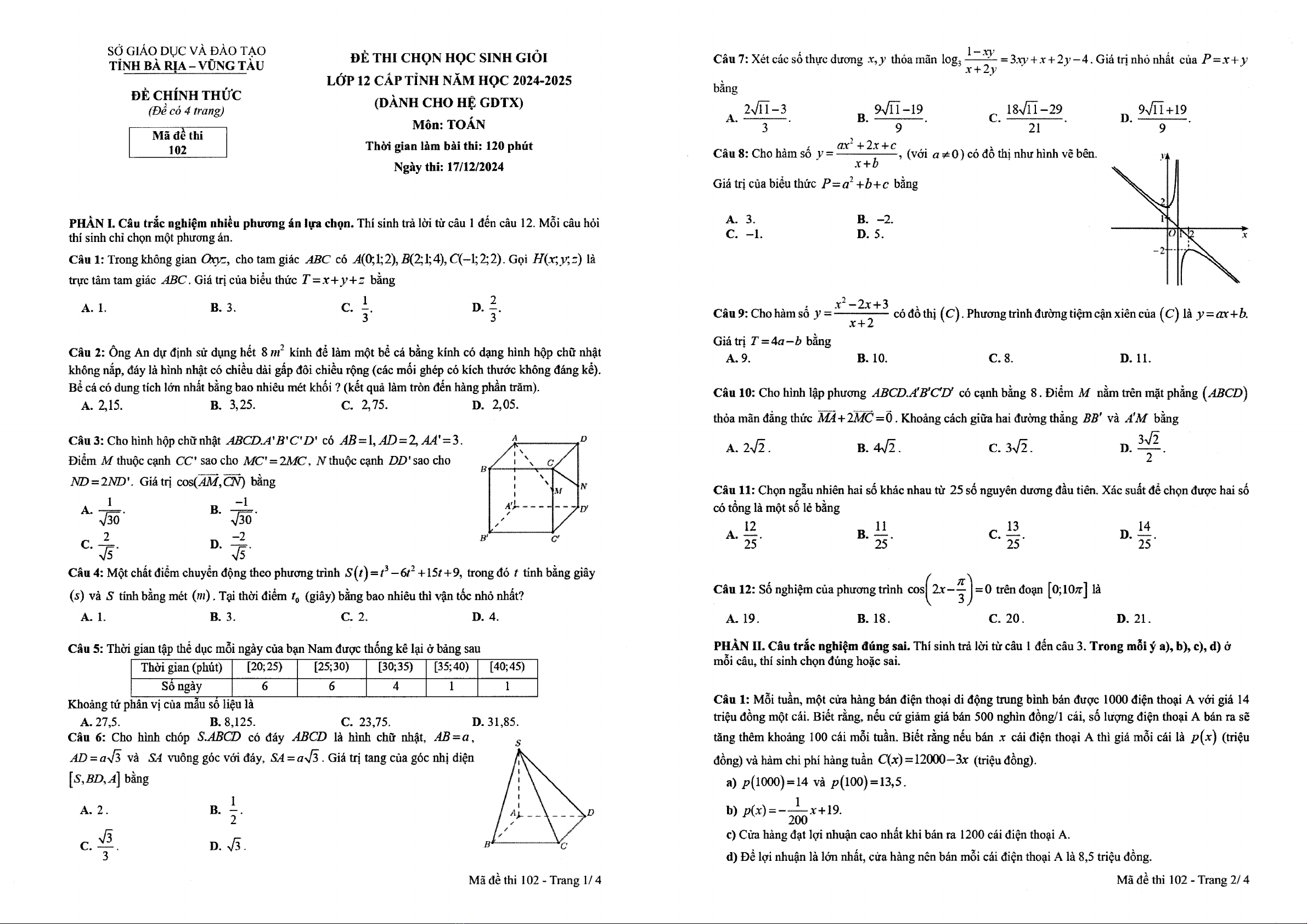 Tài liệu đề thi học sinh giỏi cấp tỉnh môn Toán lớp 12 năm 2024-2025 do Sở GD&ĐT Bà Rịa - Vũng Tàu (GDTX) phát hành, trình bày các vấn đề toán với mục đích giúp học sinh lớp 12 rèn luyện kỹ năng giải quyết vấn đề, phát triển tư duy logic và suy nghĩ phê phán.