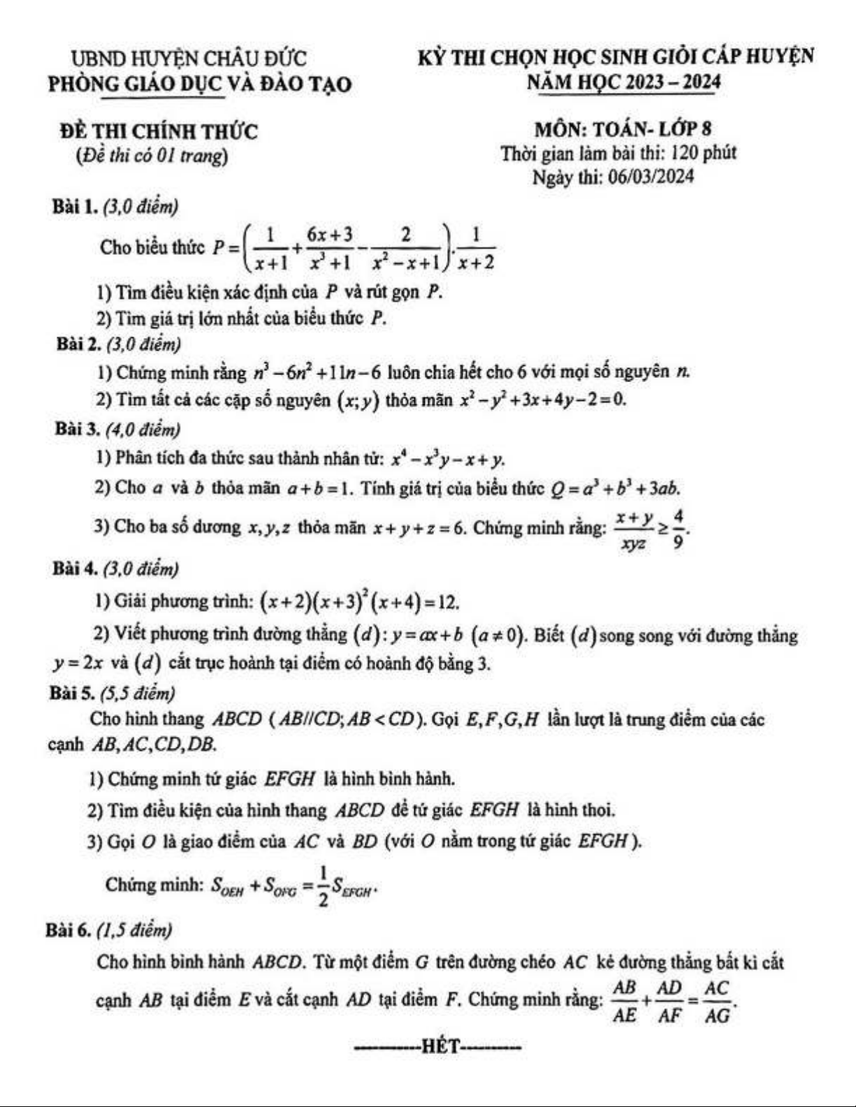 Đề thi học sinh giỏi cấp huyện môn Toán lớp 8 năm 2023-2024 - Phòng GD&ĐT Châu Đức