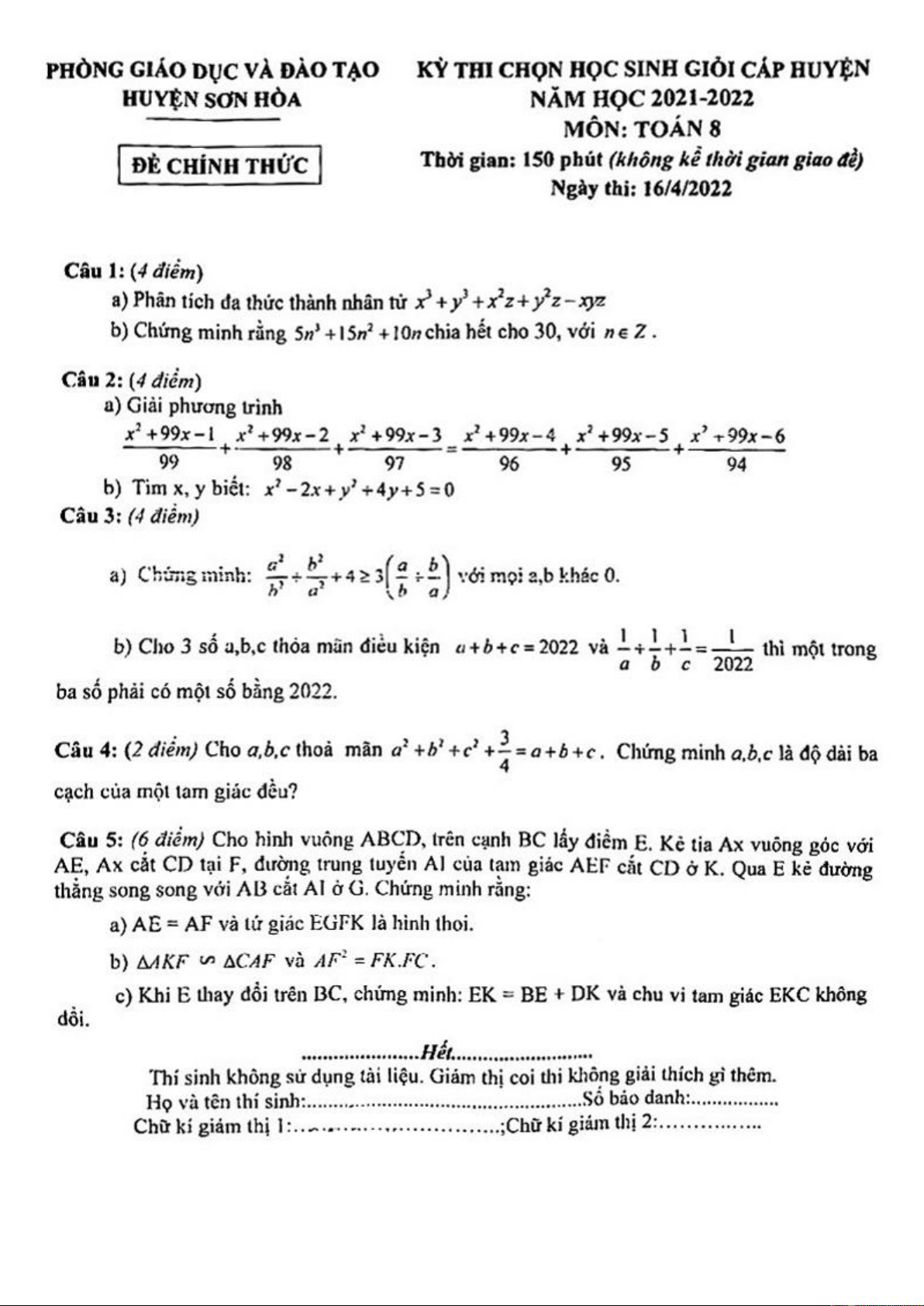 Đề thi chọn học sinh giỏi cấp huyện môn Toán lớp 8 năm 2021-2022 - Phòng GD&ĐT huyện Sơn Hòa