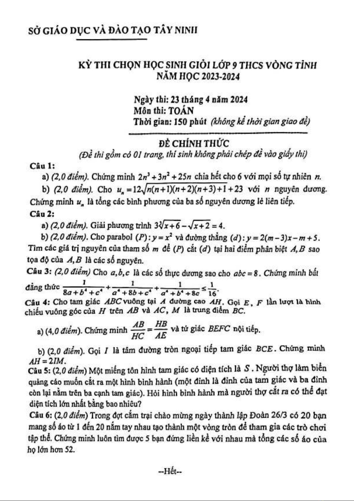 Đề thi học sinh giỏi cấp tỉnh môn Toán lớp 9 năm 2023-2024 - Sở GD&ĐT Tây Ninh