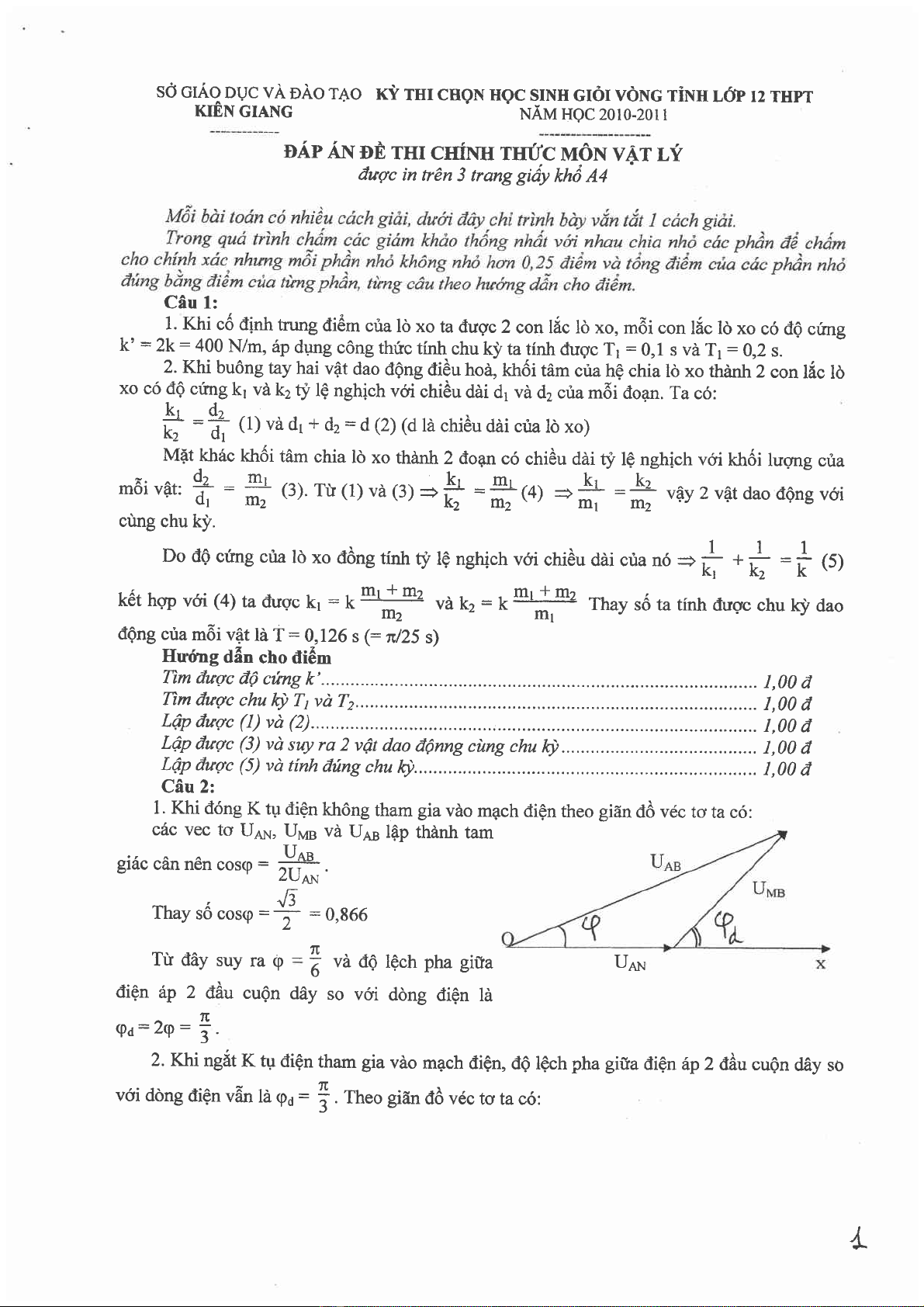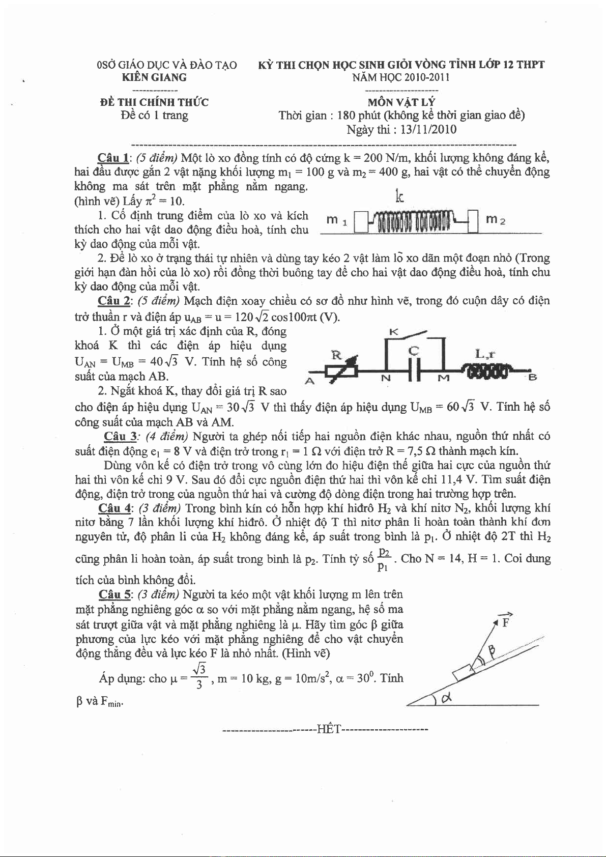 Đề thi chọn học sinh giỏi cấp tỉnh môn Vật lý lớp 12 năm học 2010-2011 – Sở Giáo dục và Đào tạo Kiên Giang (Đề chính thức)