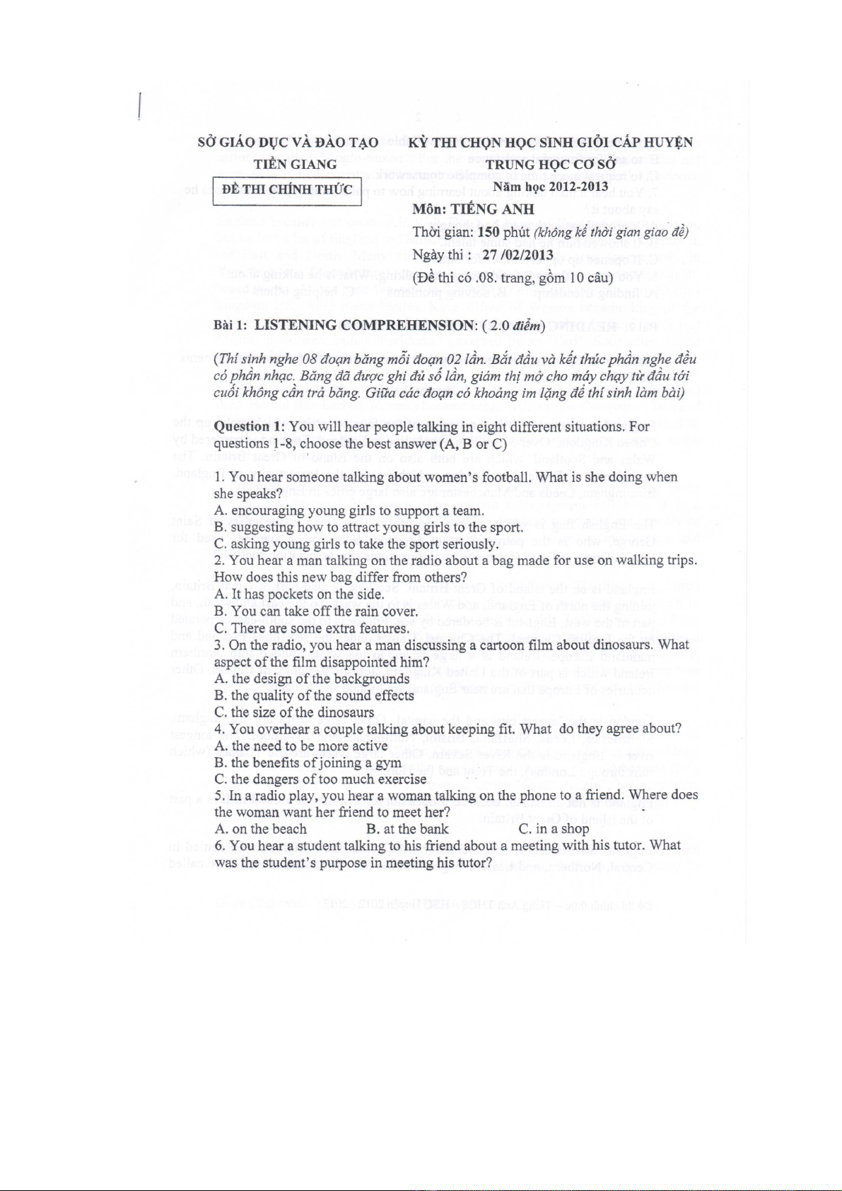 Đề thi học sinh giỏi Tiếng Anh 9 cấp huyện - Sở GD&ĐT Tiền Giang (2012-2013) dành cho học sinh lớp 9 đang chuẩn bị thi chọn học sinh giỏi, giúp các em phát triển tư duy. Chúc các bạn đạt được điểm cao trong kì thi này nhé.