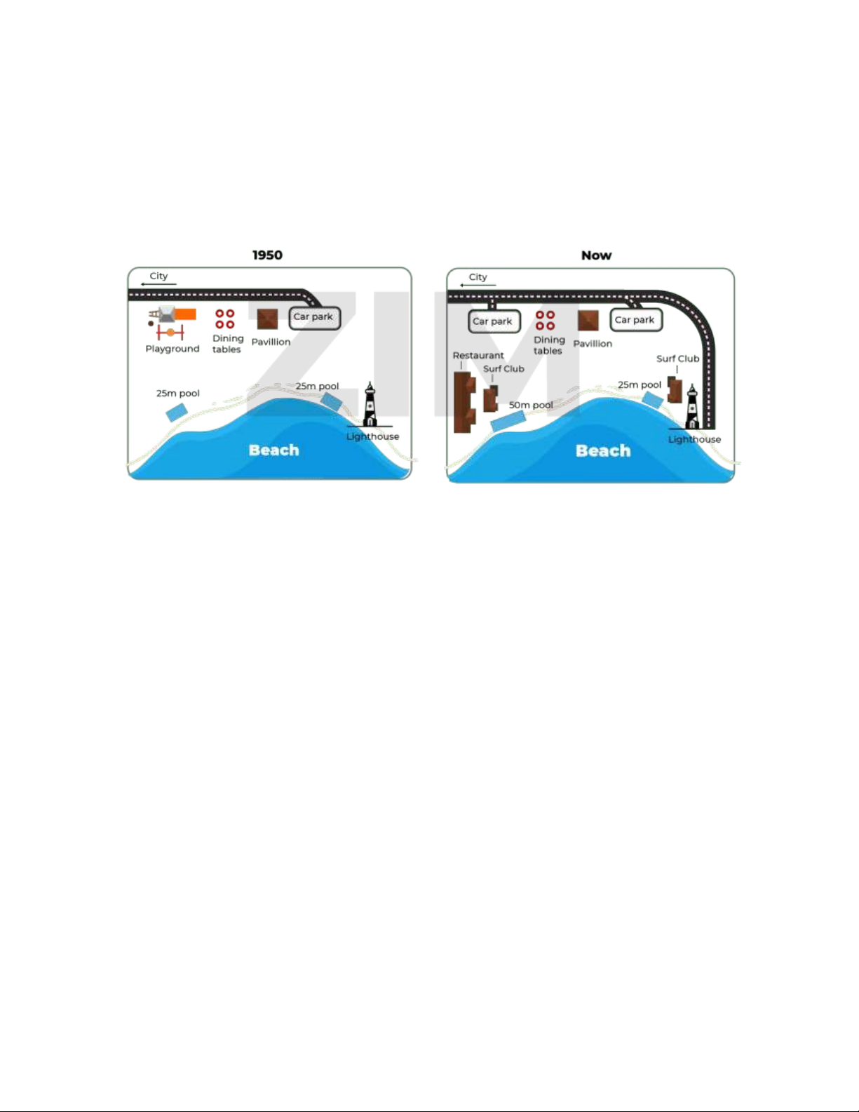 Task 1: The maps show a beachfront in Australia in 1950 and today.