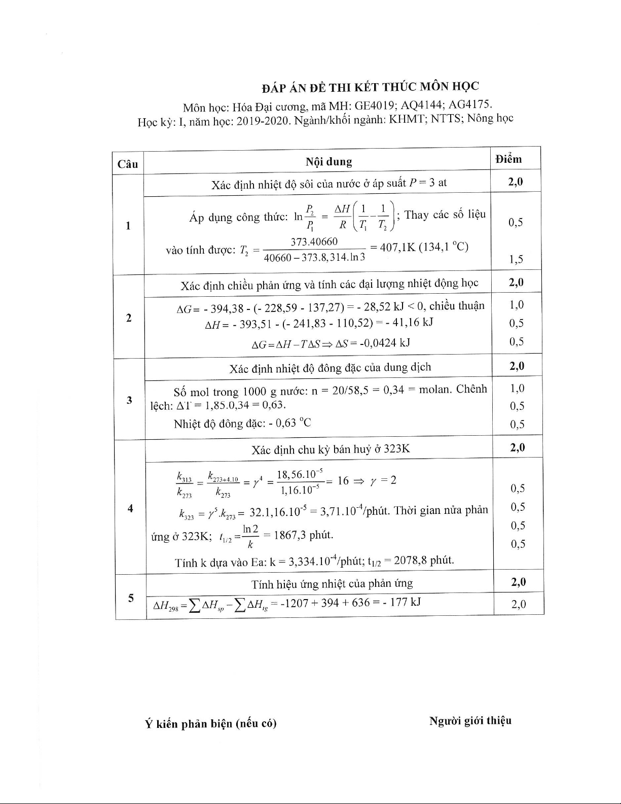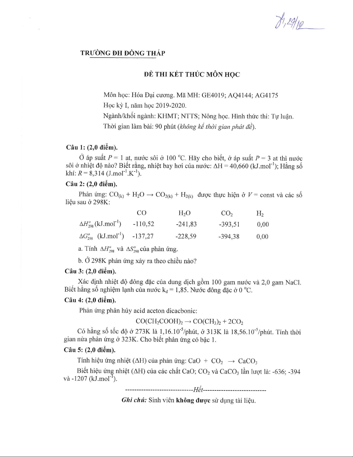 Đề thi kết thúc học phần học kì 1 môn Hóa đại cương 1 năm 2019-2020 có đáp án - Trường ĐH Đồng Tháp