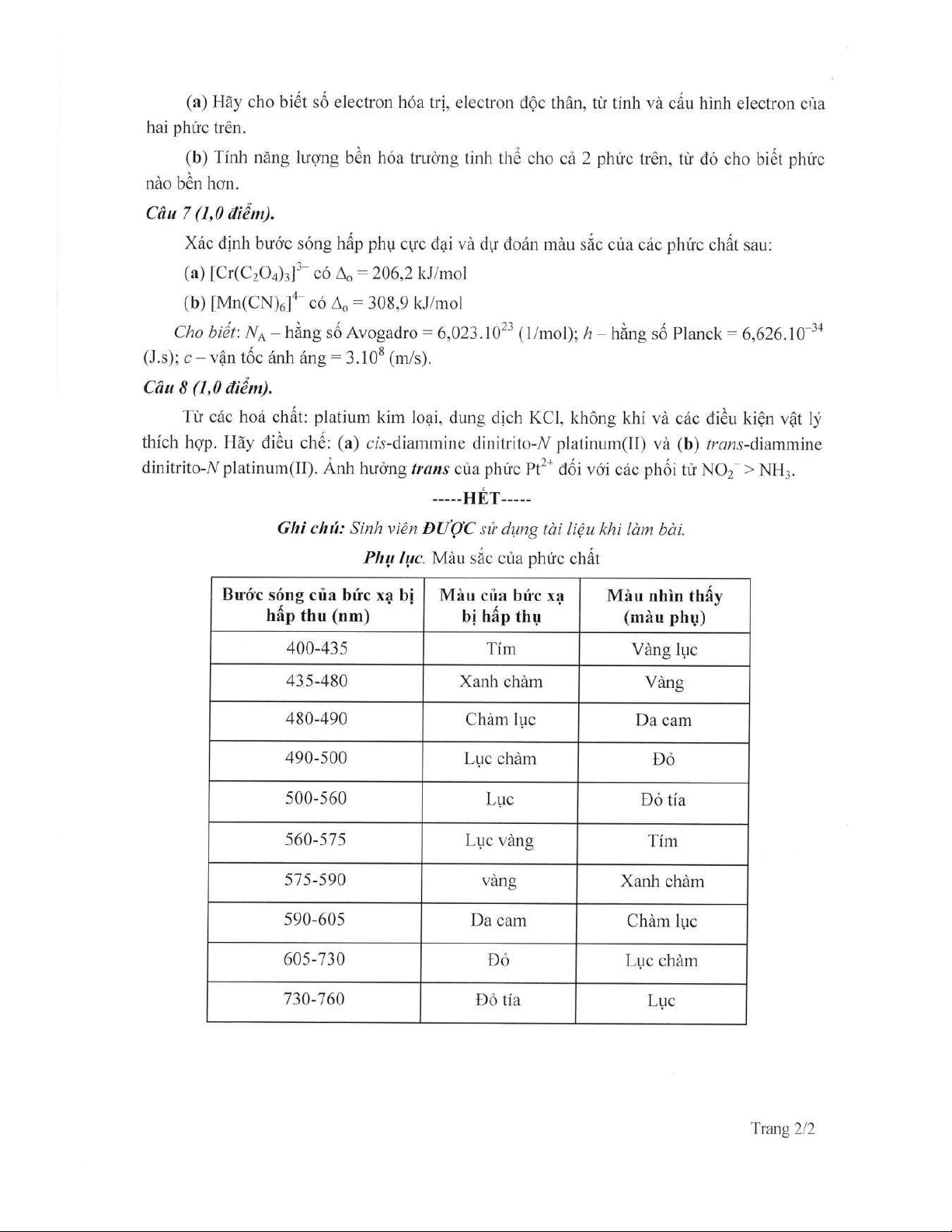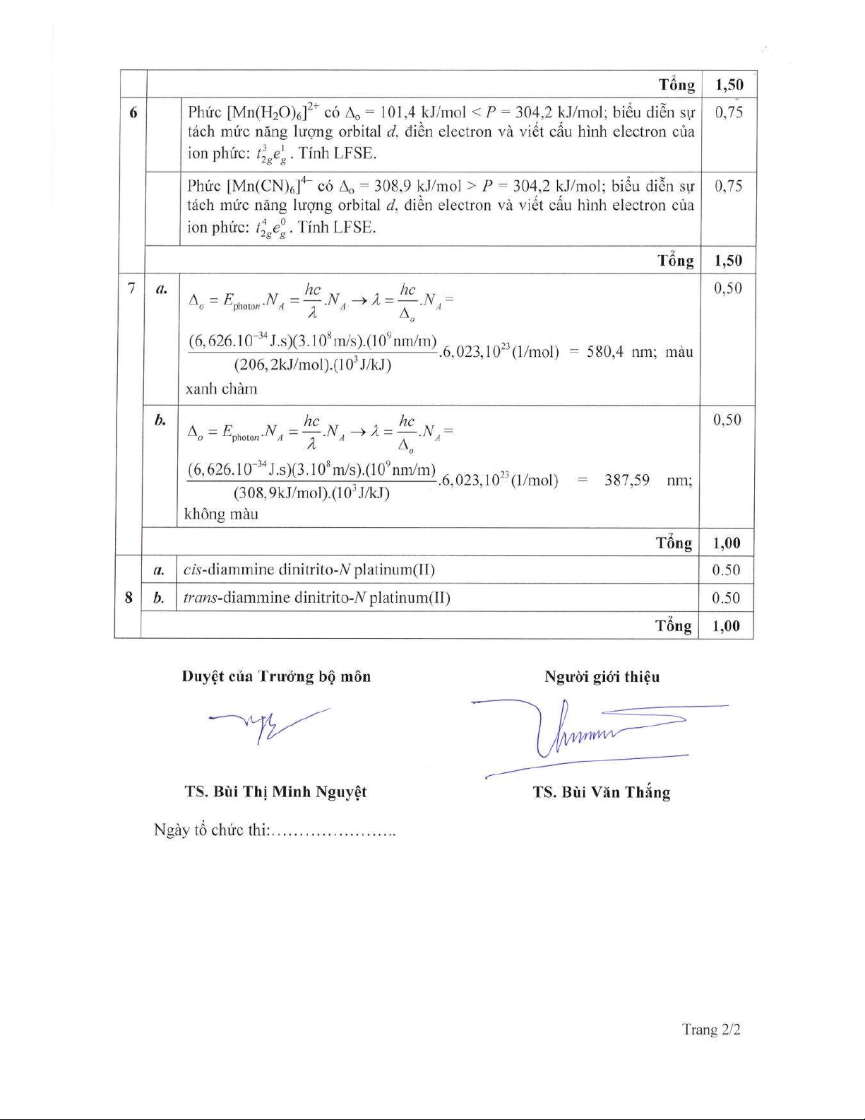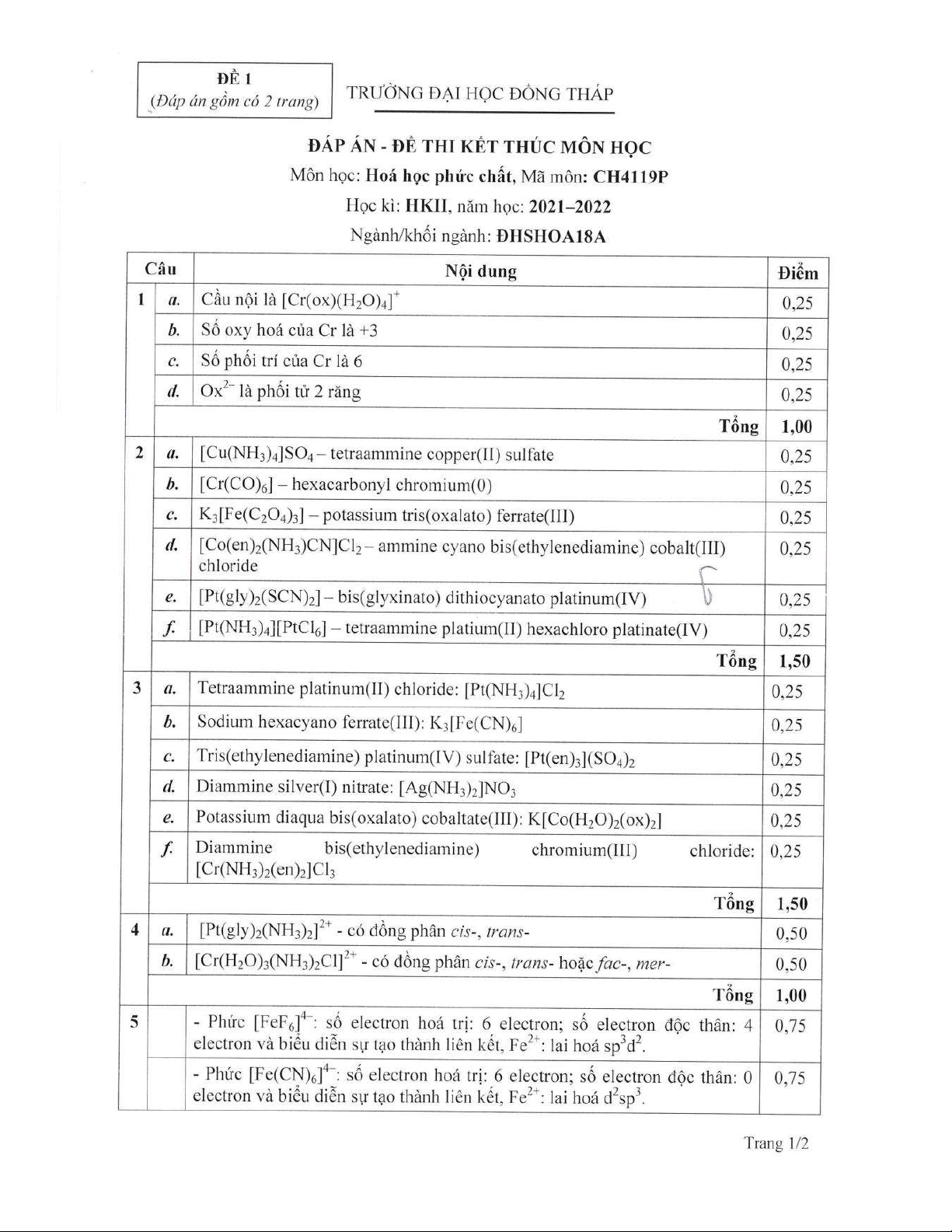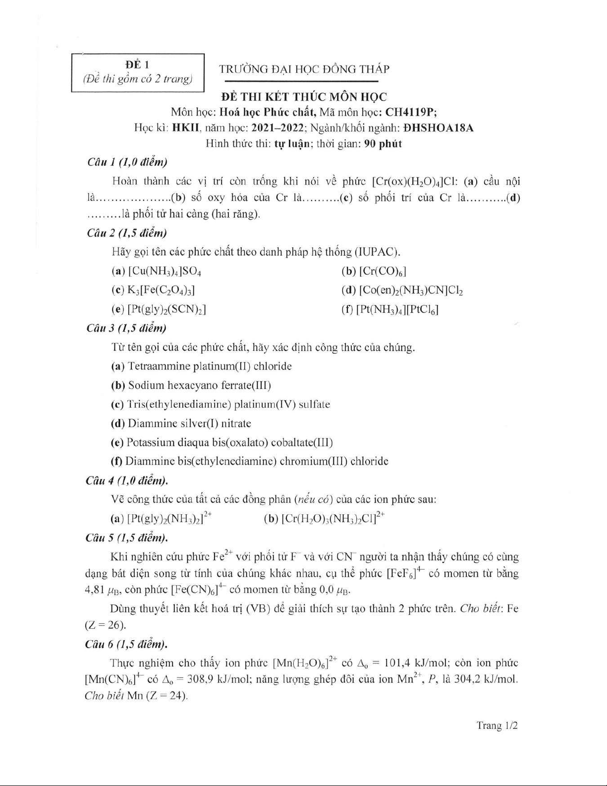 Đề thi kết thúc học phần học kì 2 môn Hóa học phức chất năm 2021-2022 có đáp án - Trường ĐH Đồng Tháp