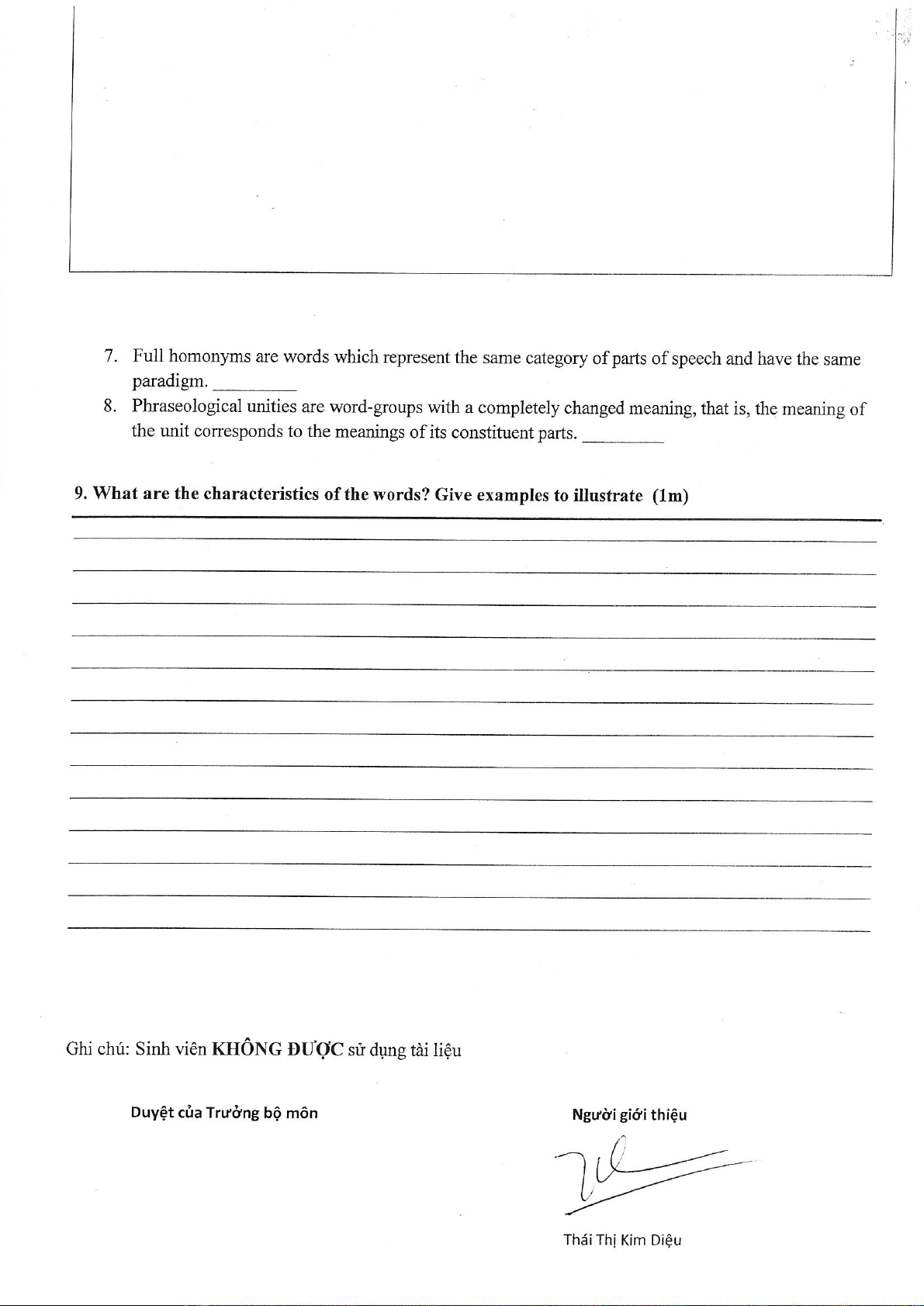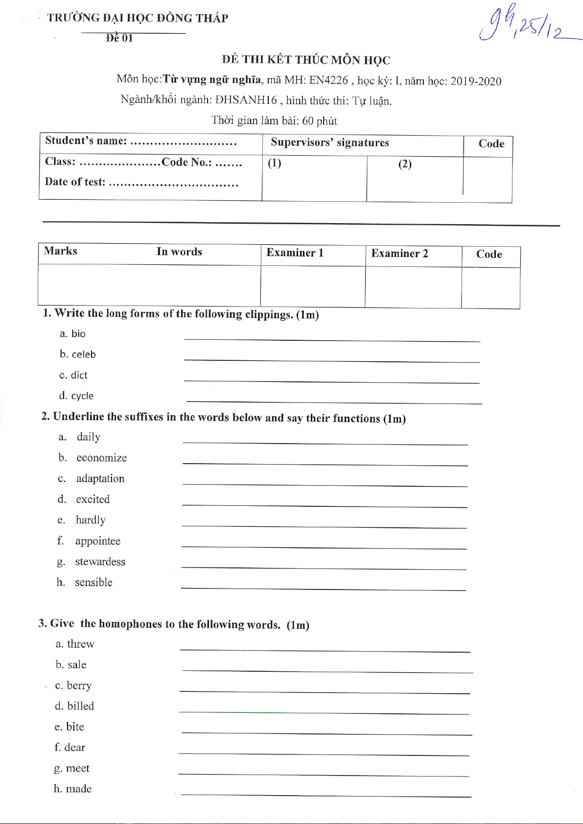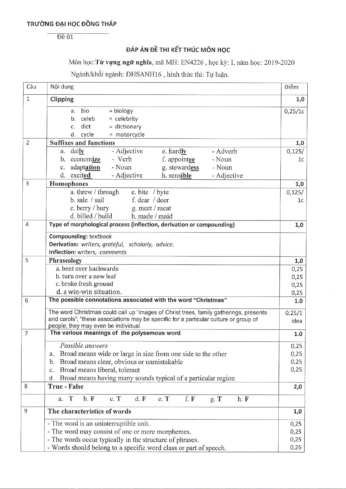 Đề thi kết thúc học phần học kì 1 môn Từ vựng ngữ nghĩa năm 2019-2020 có đáp án - Trường ĐH Đồng Tháp