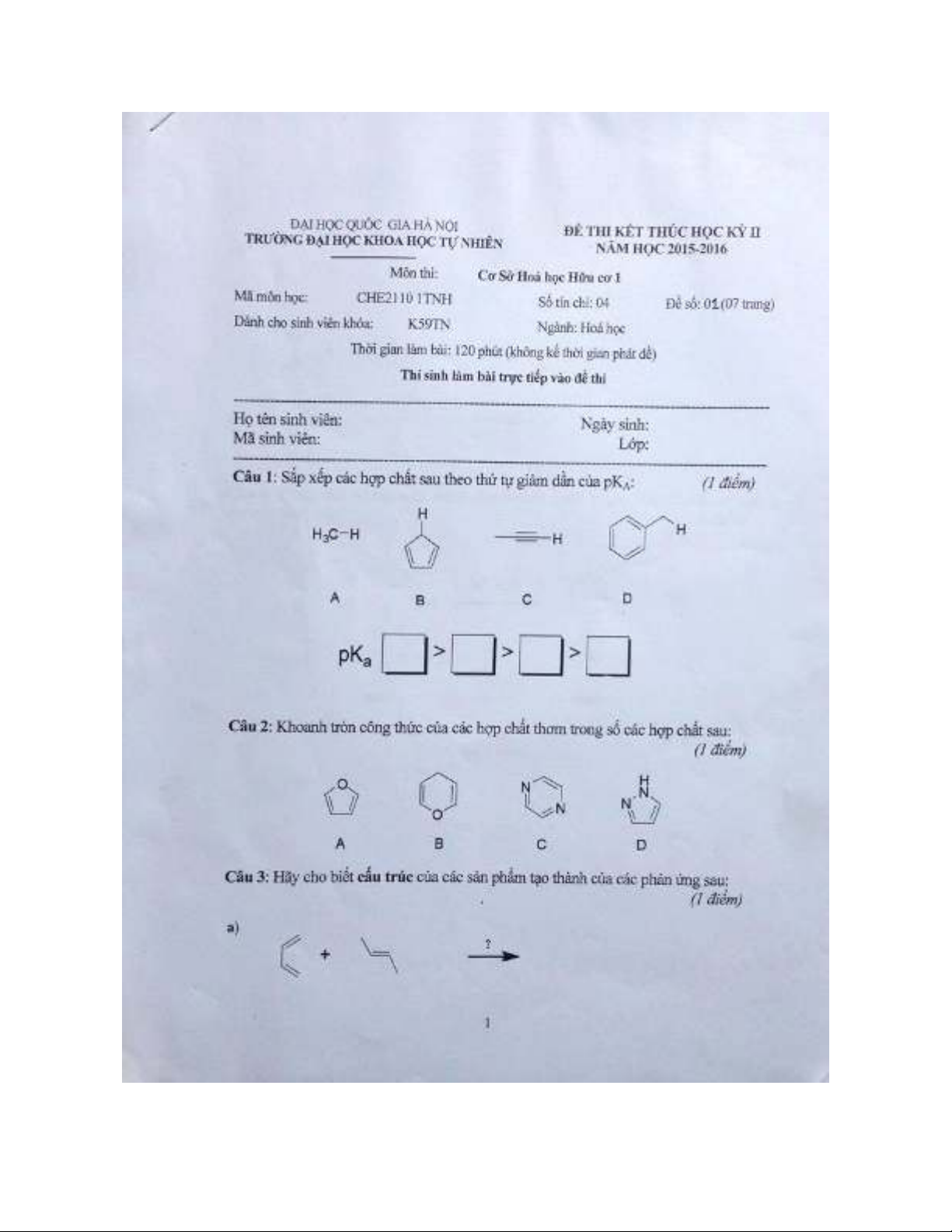 Đề thi kết thúc học kỳ II năm học 2016-2017 môn Cơ sở hóa học hữu cơ 1 (Đề số 1) - ĐH Khoa học Tự nhiên