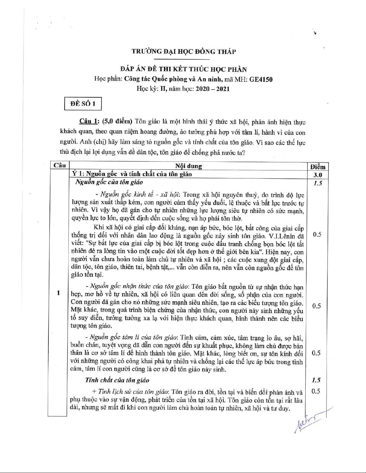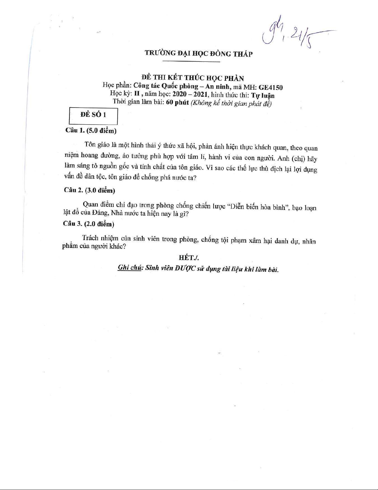 Đề thi kết thúc học phần học kì 2 môn Công tác Quốc phòng An ninh năm 2020-2021 có đáp án - Trường ĐH Đồng Tháp