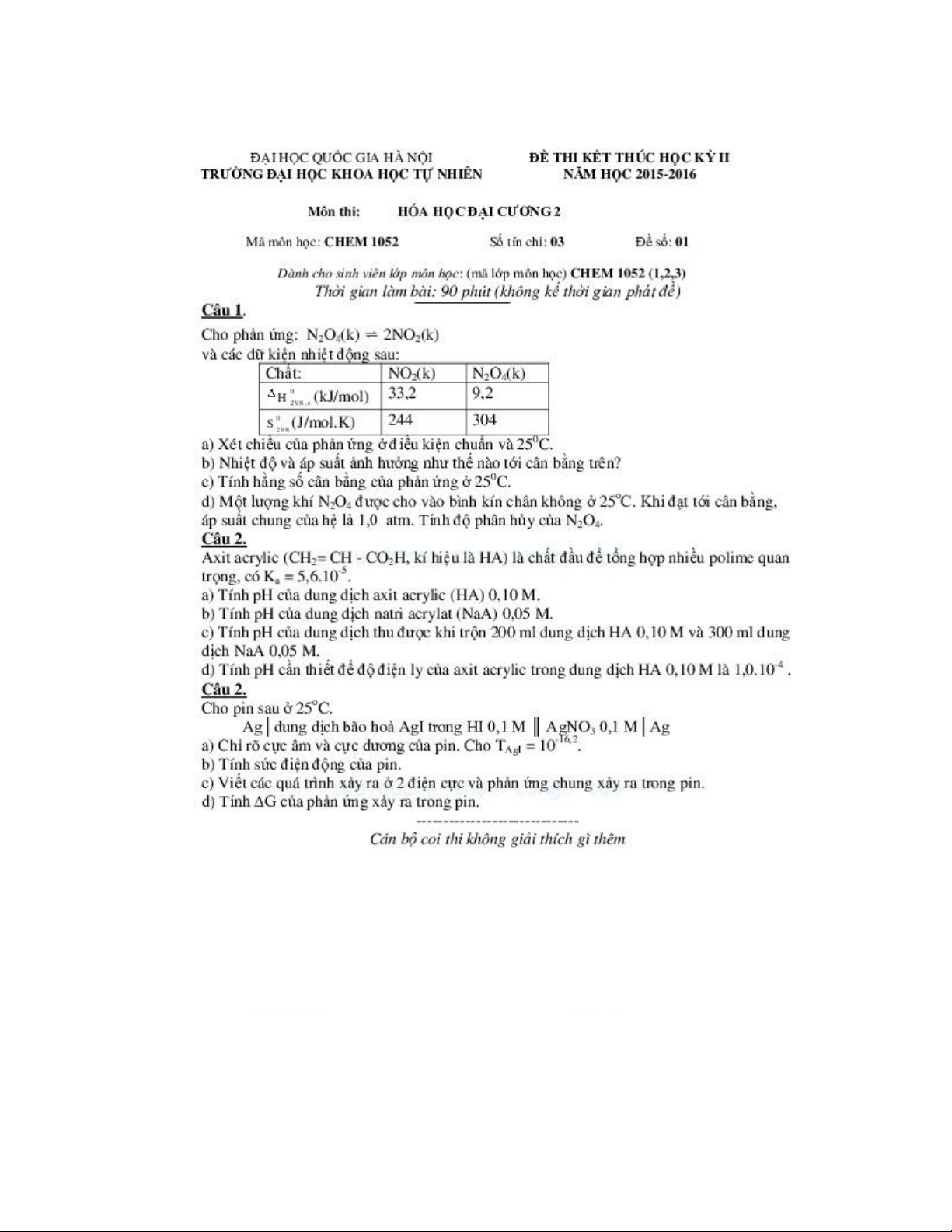 Đề thi kết thúc học kỳ II năm học 2015-2016 môn Hóa học đại cương 2 - ĐH Khoa học Tự nhiên
