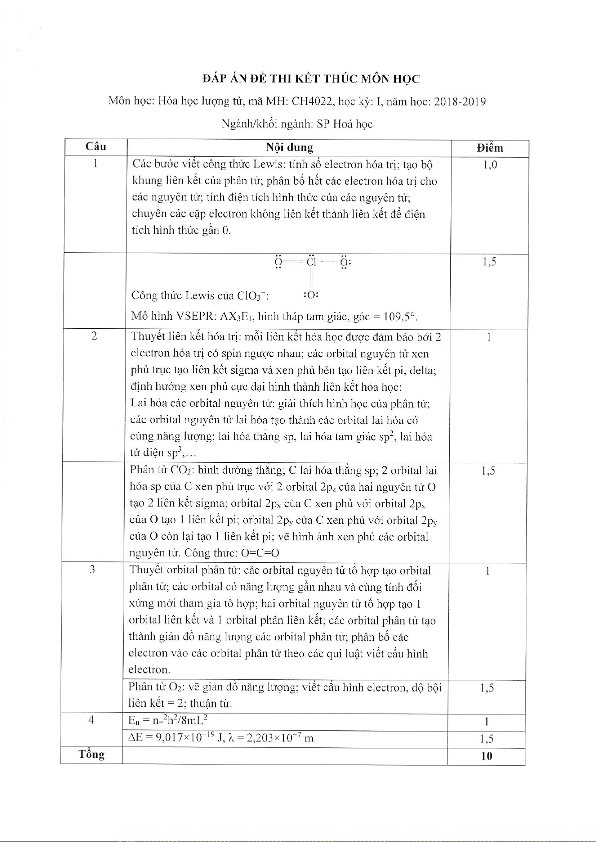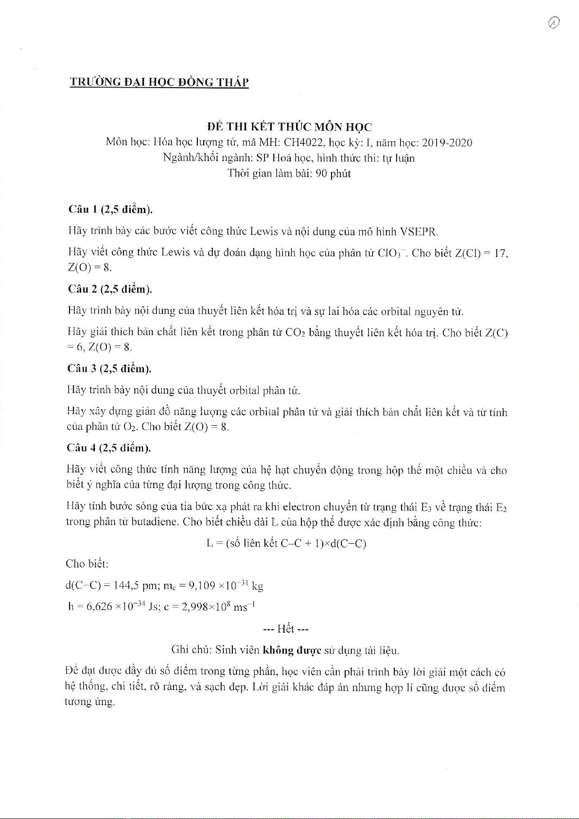 Đề thi kết thúc học phần học kì 1 môn Hóa học lượng tử năm 2019-2020 có đáp án - Trường ĐH Đồng Tháp