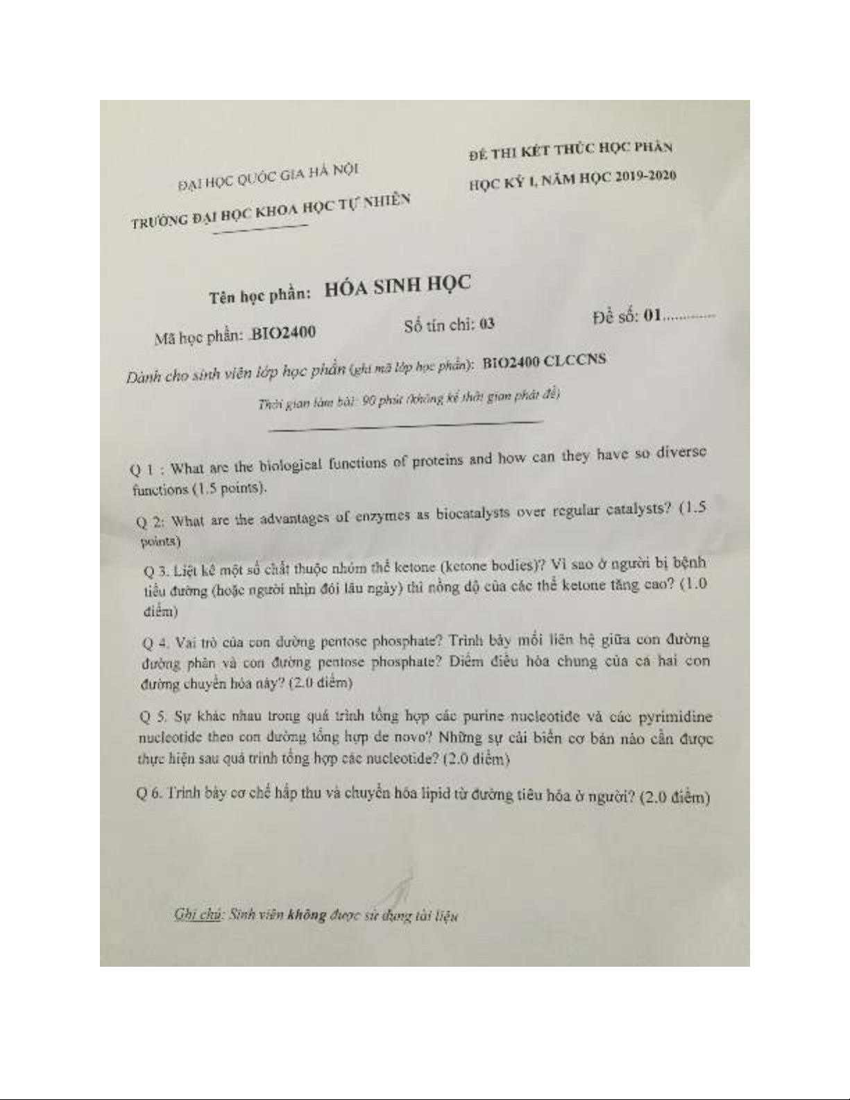 Đề thi kết thúc học kỳ I năm học 2019-2020 môn Hóa sinh học (Đề số 1) - ĐH Khoa học Tự nhiên