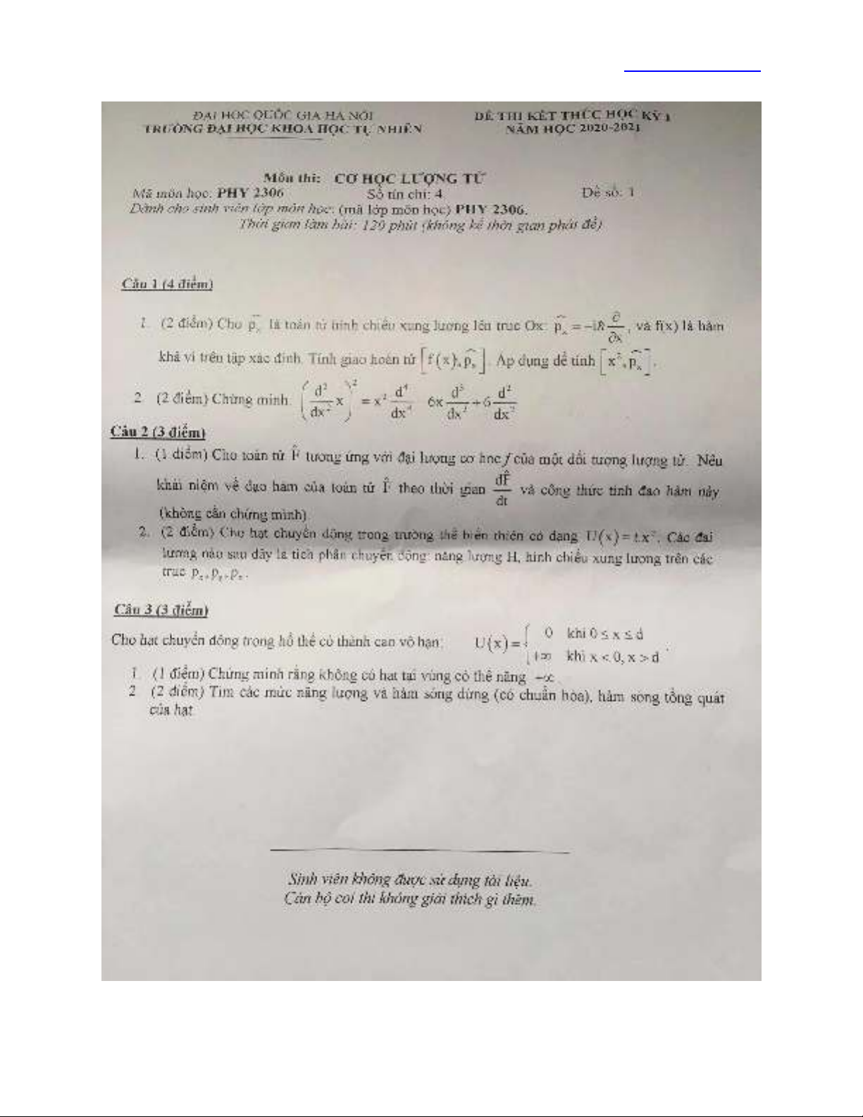 Đề thi kết thúc học kỳ I năm học 2020-2021 môn Cơ học lượng tử - ĐH Khoa học Tự nhiên (Đề số 1)
