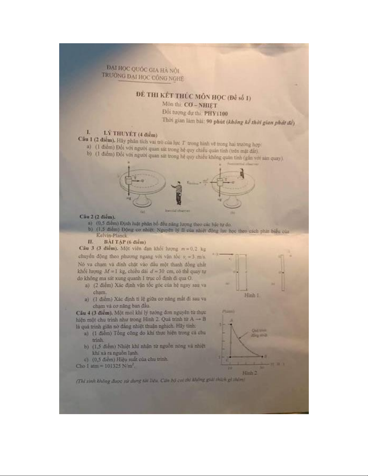 Đề thi kết thúc học kỳ I năm học 2018-2019 môn Cơ - Nhiệt - ĐH Khoa học Tự nhiên (ĐHQGHN)