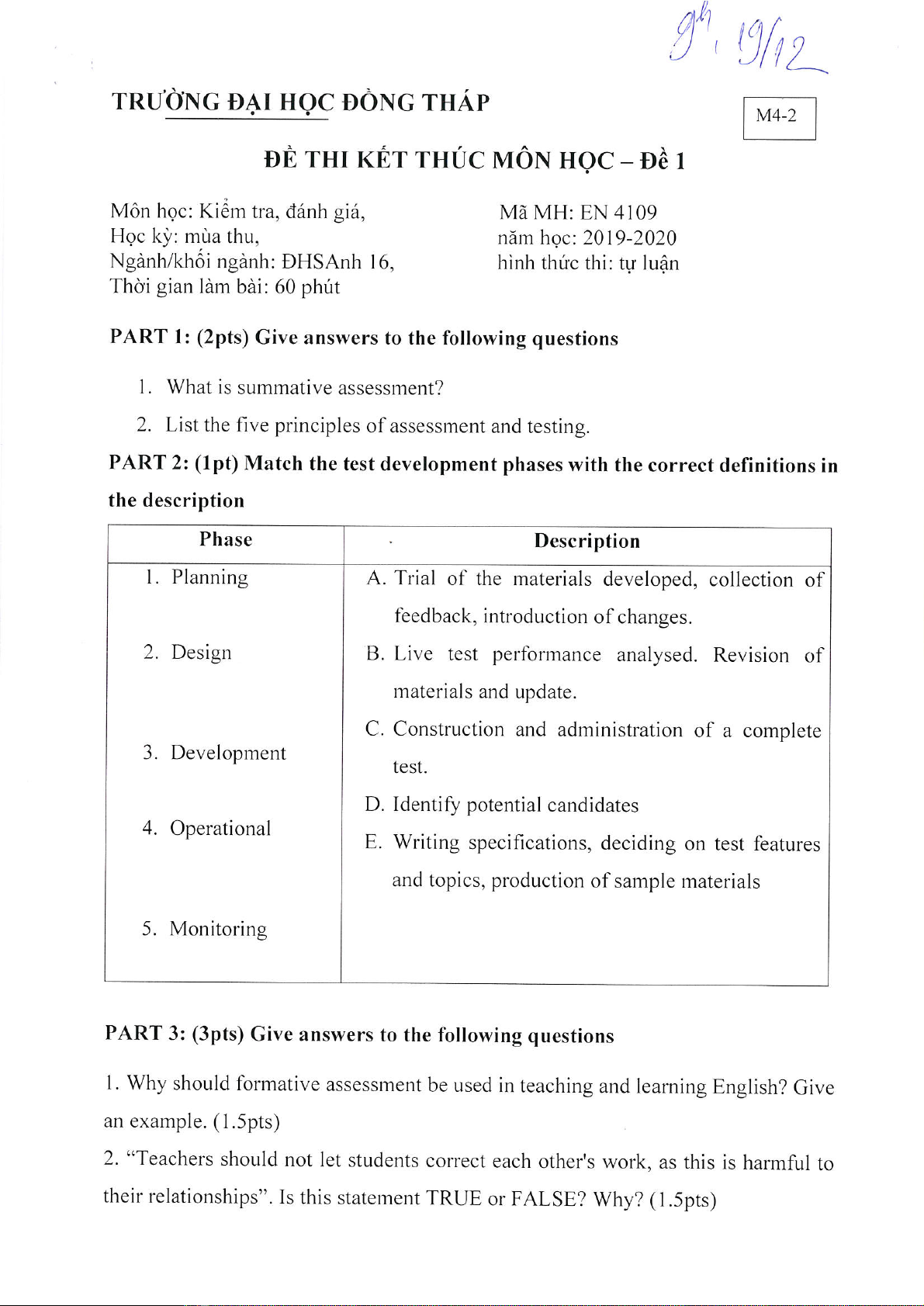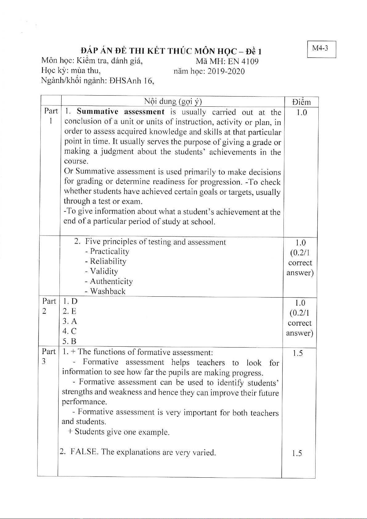 Đề thi kết thúc học phần học kì 1 môn Kiểm tra, đánh giá năm 2019-2020 có đáp án - Trường ĐH Đồng Tháp