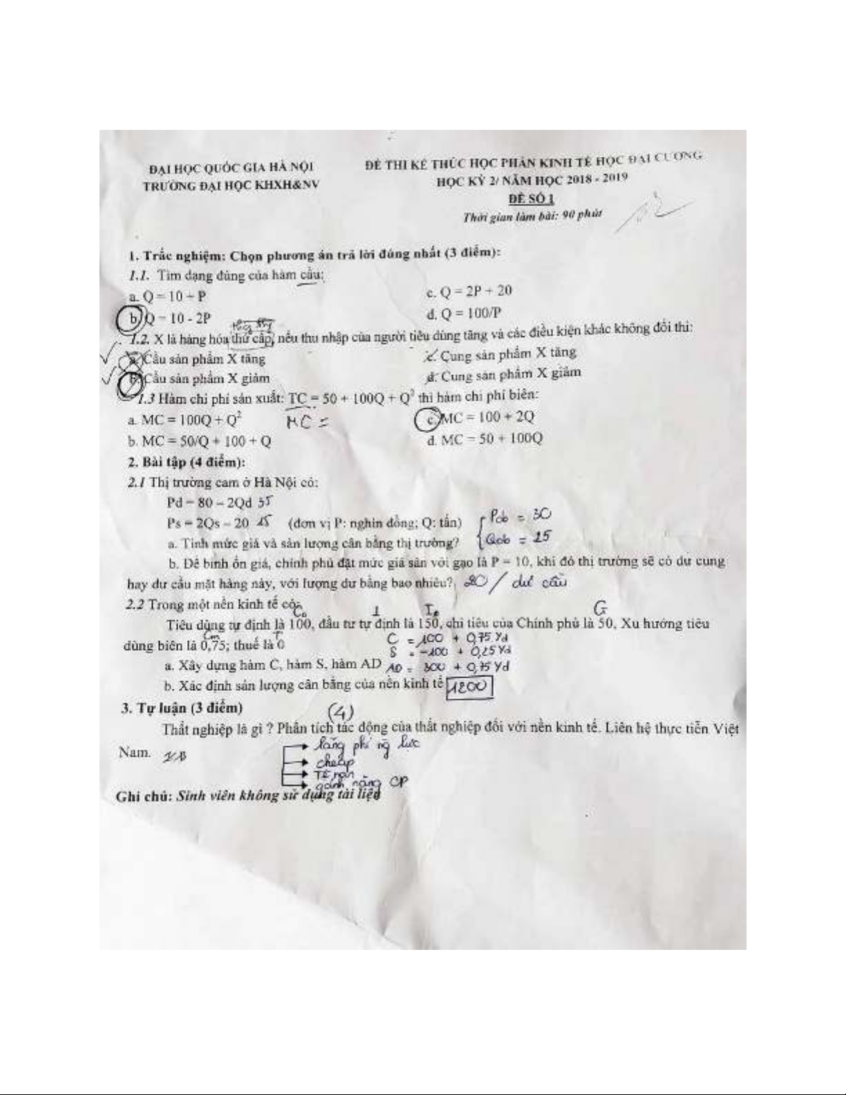 Đề thi kết thúc học kỳ II năm học 2018-2019 môn Kinh tế học đại cương (Đề số 1) - ĐH Khoa học Xã hội và Nhân văn