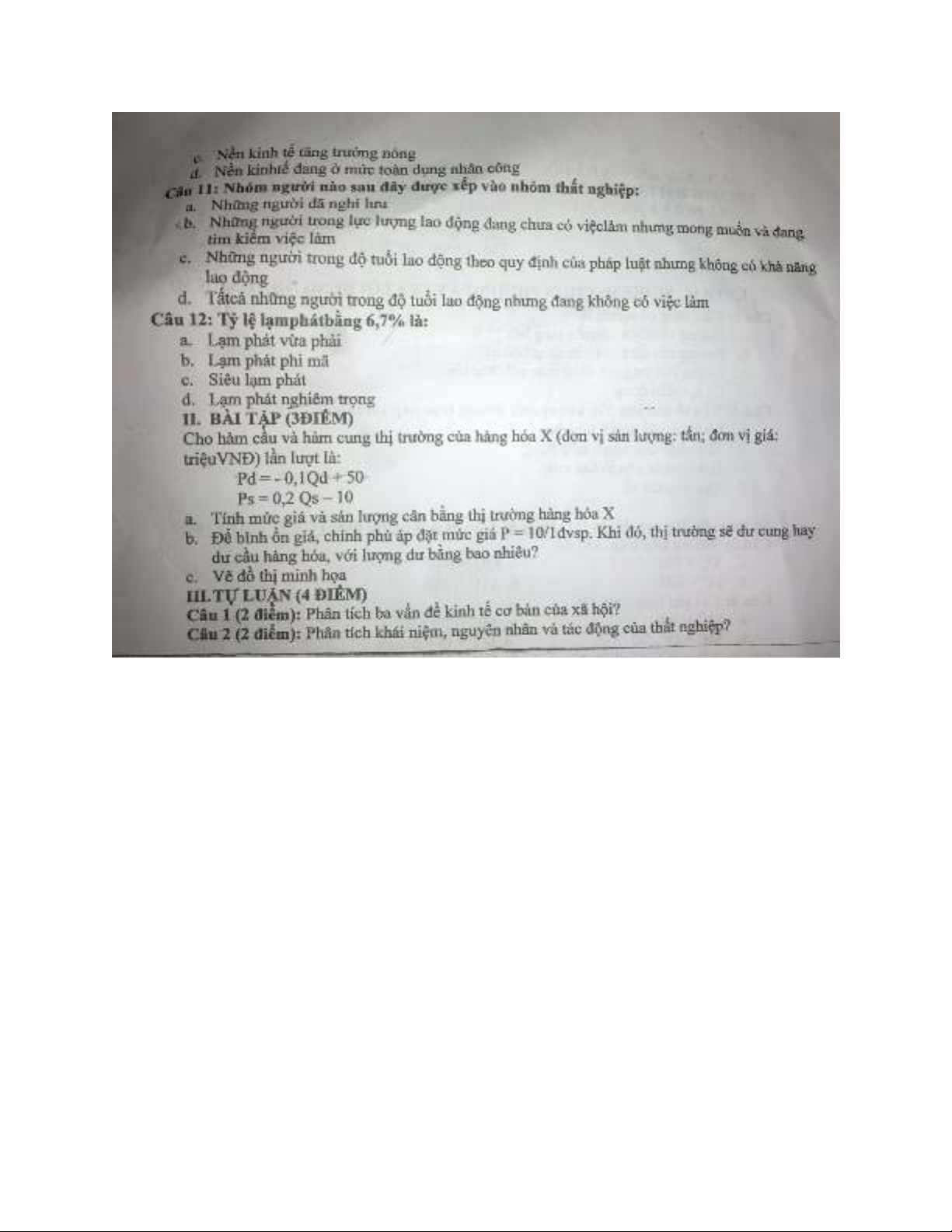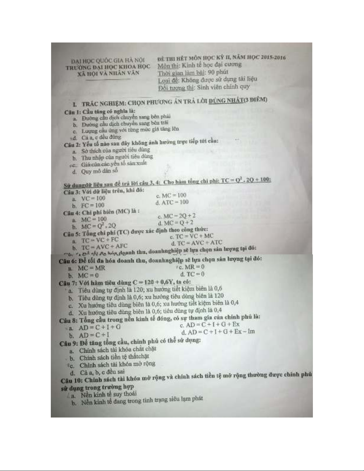 Đề thi kết thúc học kỳ II năm học 2015-2016 môn Kinh tế học đại cương - ĐH Khoa học Xã hội và Nhân văn