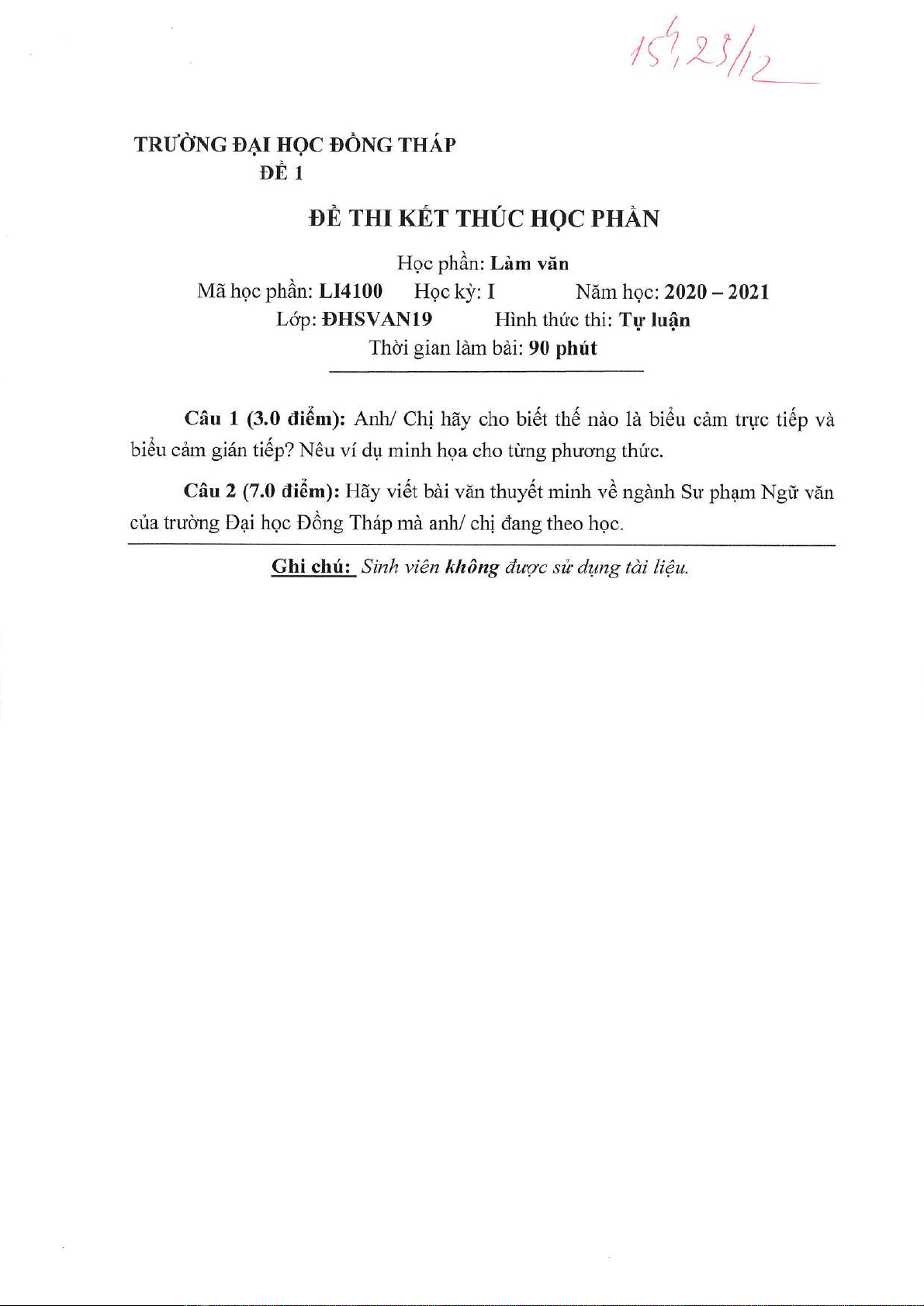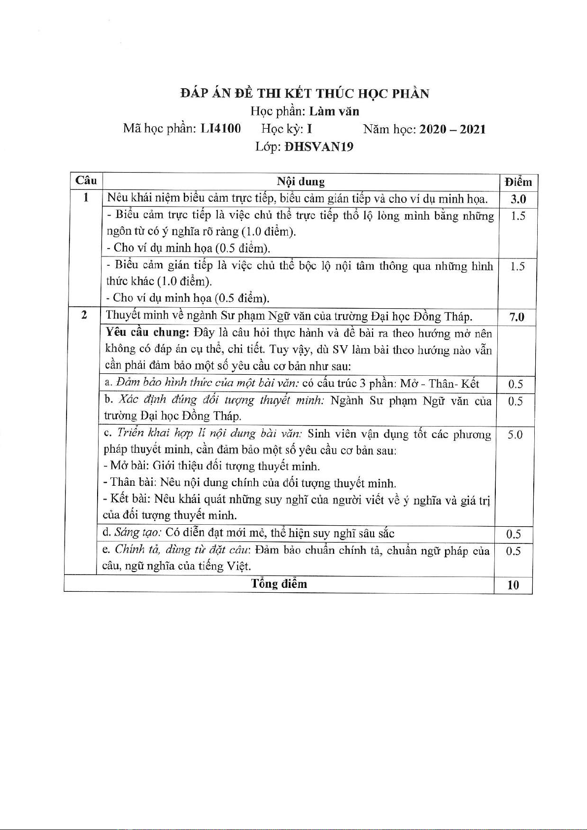 Đề thi kết thúc học phần học kì 1 môn Làm văn năm 2020-2021 có đáp án - Trường ĐH Đồng Tháp