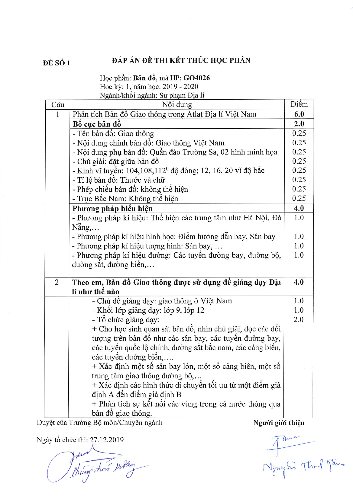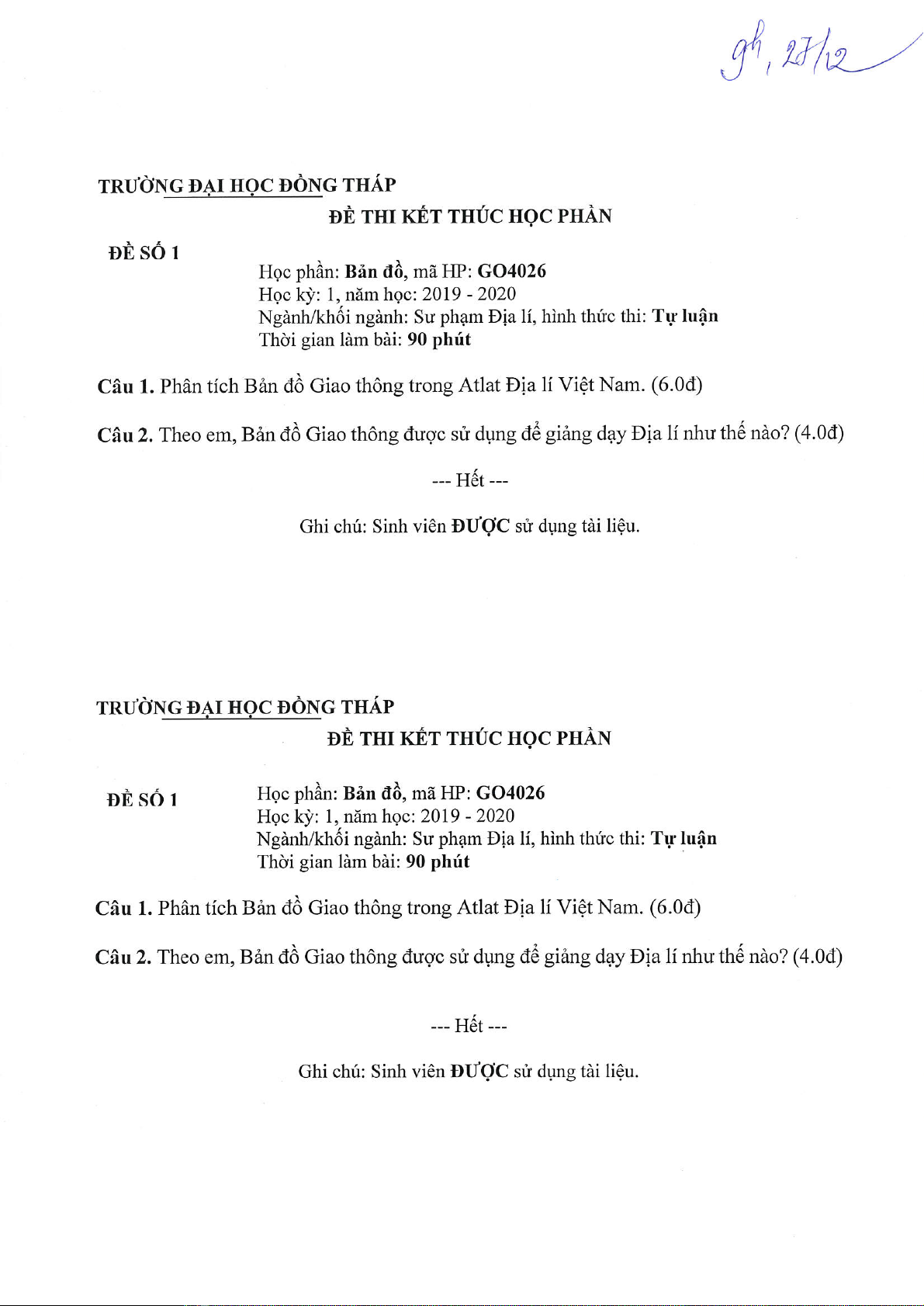 Đề thi kết thúc học phần học kì 1 môn Bản đồ năm 2019-2020 có đáp án - Trường ĐH Đồng Tháp
