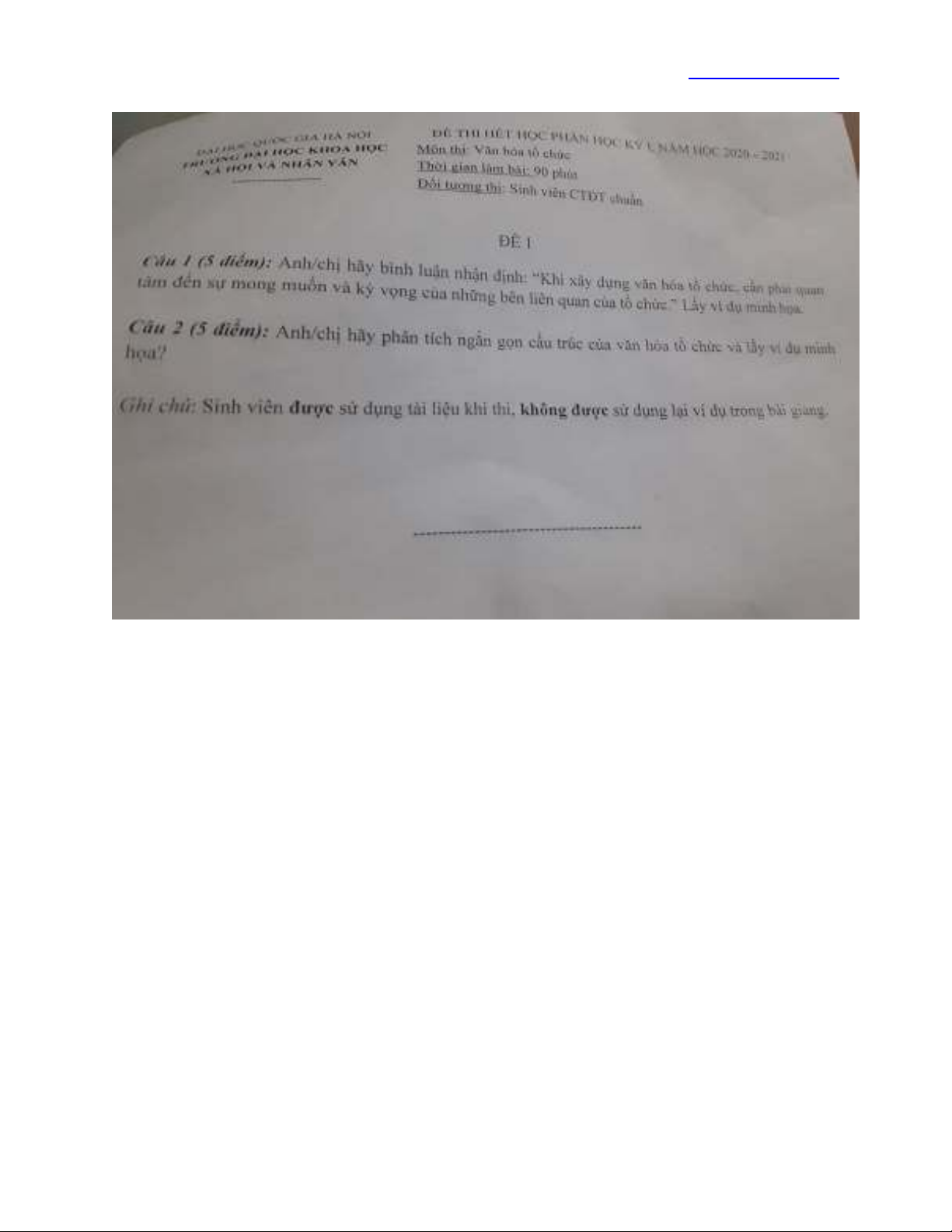 Đề thi kết thúc học kỳ I năm học 2020-2021 môn Văn hóa tổ chức (Đề số 1) - ĐH Khoa học Xã hội và Nhân văn