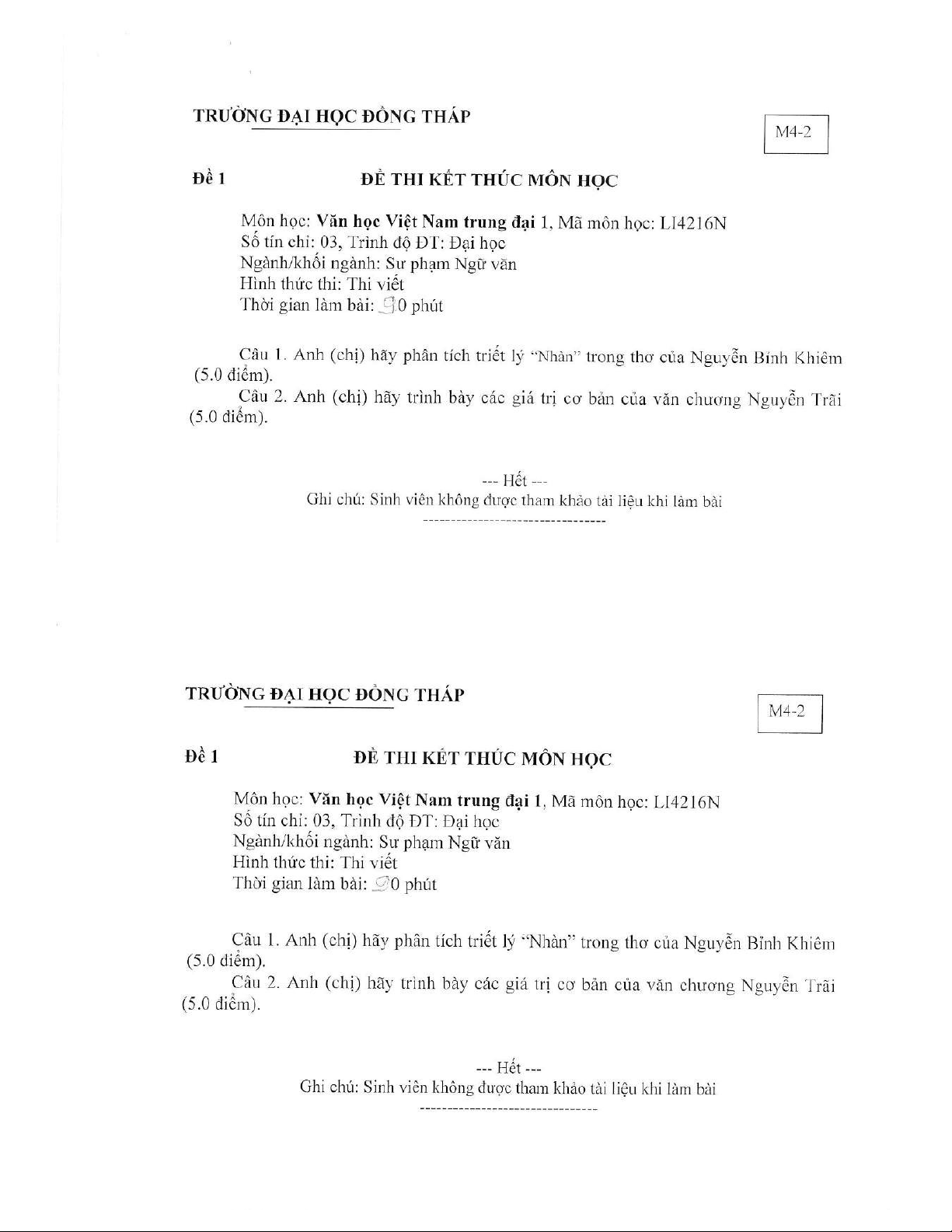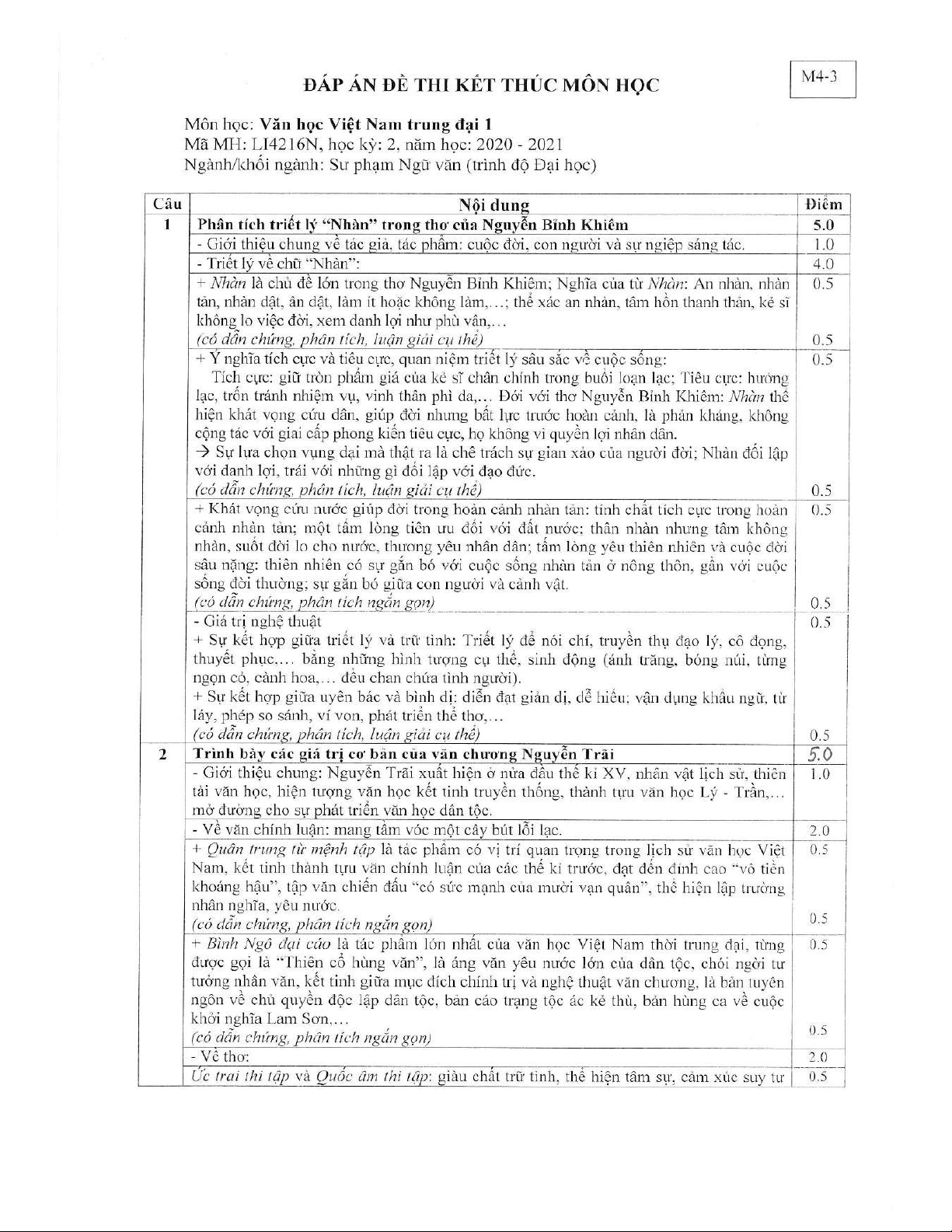 Đề thi kết thúc học phần học kì 2 môn Văn học Việt Nam trung đại 1 năm 2020-2021 có đáp án - Trường ĐH Đồng Tháp