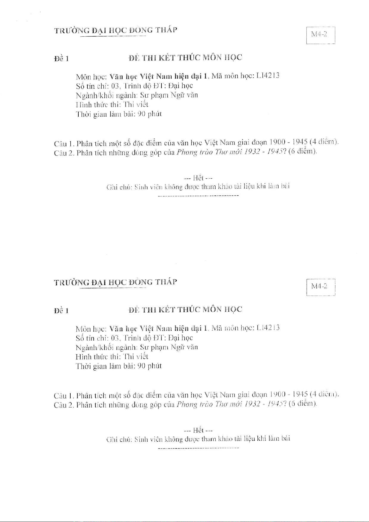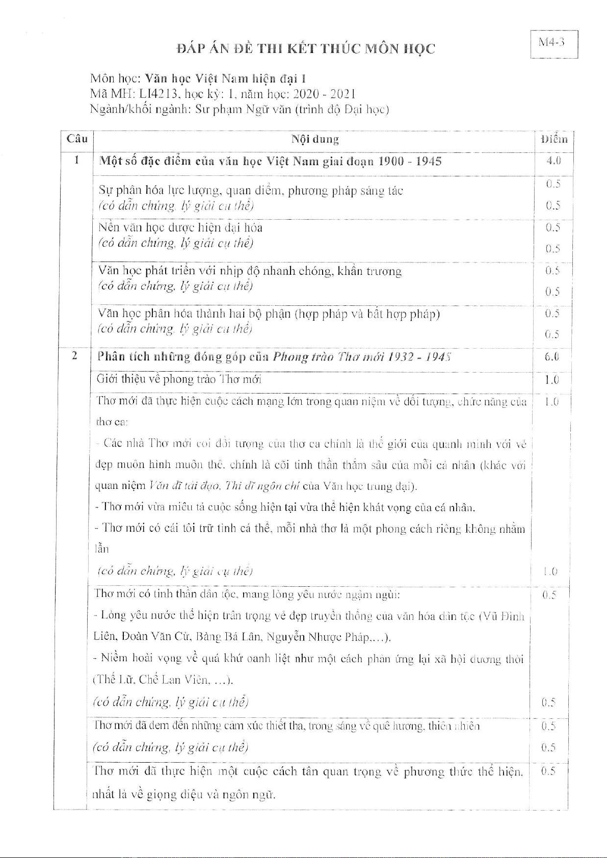 Đề thi kết thúc học phần học kì 1 môn Văn học Việt Nam hiện đại 1 năm 2020-2021 có đáp án - Trường ĐH Đồng Tháp