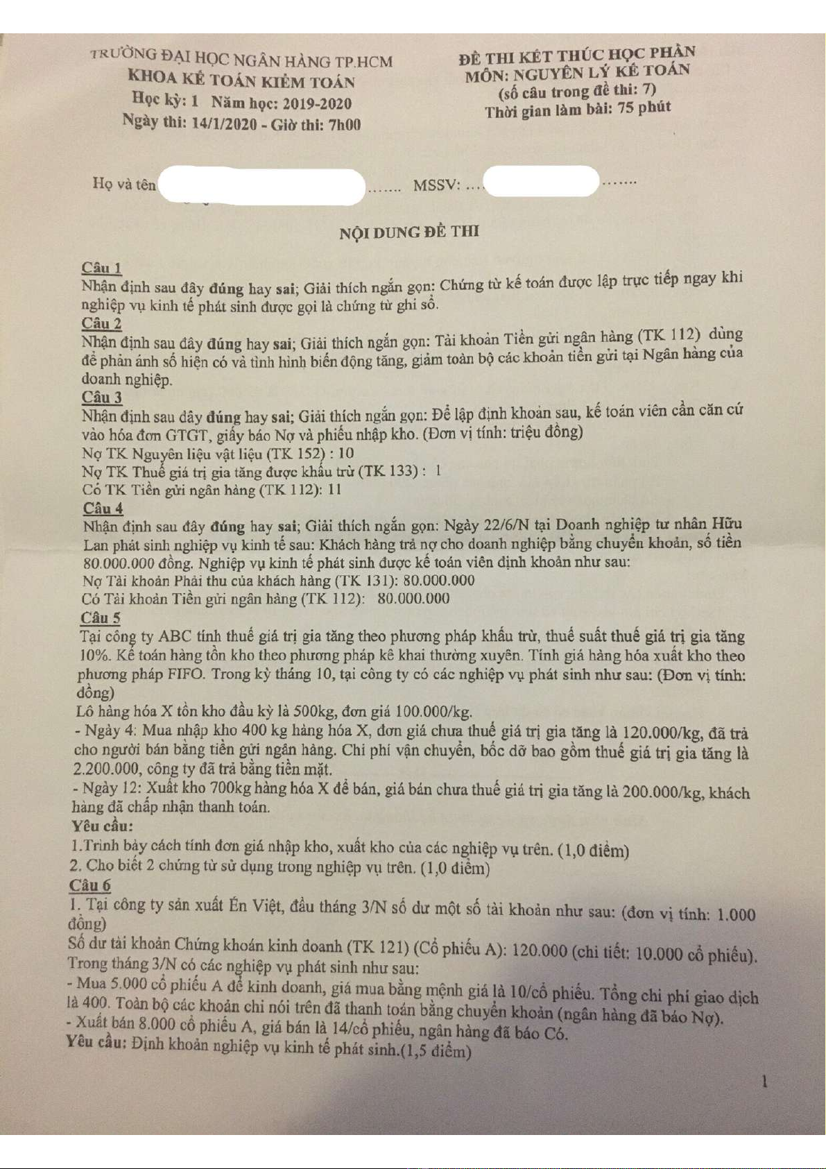 Đề thi kết thúc học phần học kỳ I năm học 2019-2020 môn Nguyên lý kế toán - ĐH Ngân hàng TP.HCM