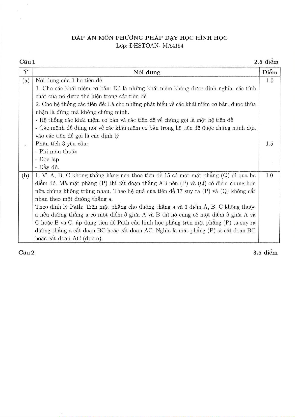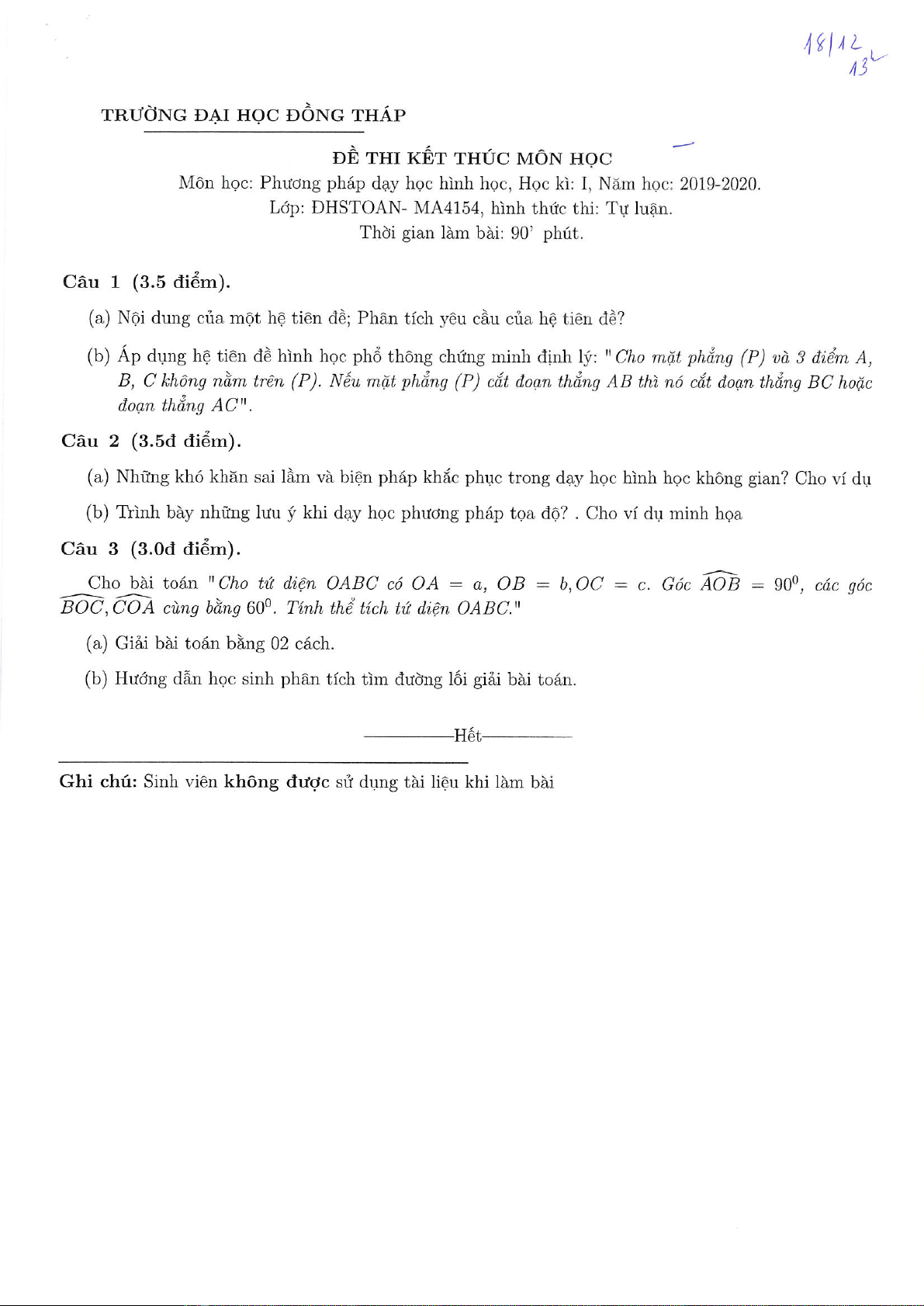 Đề thi kết thúc học phần học kì 1 môn Phương pháp dạy học hình học năm 2019-2020 có đáp án - Trường ĐH Đồng Tháp