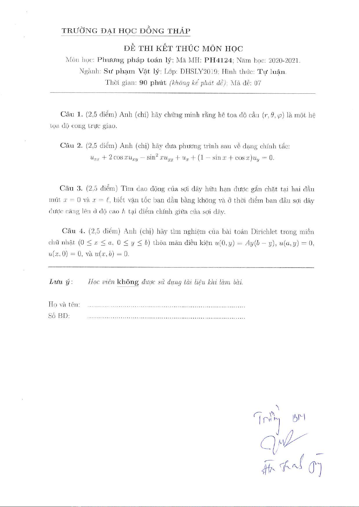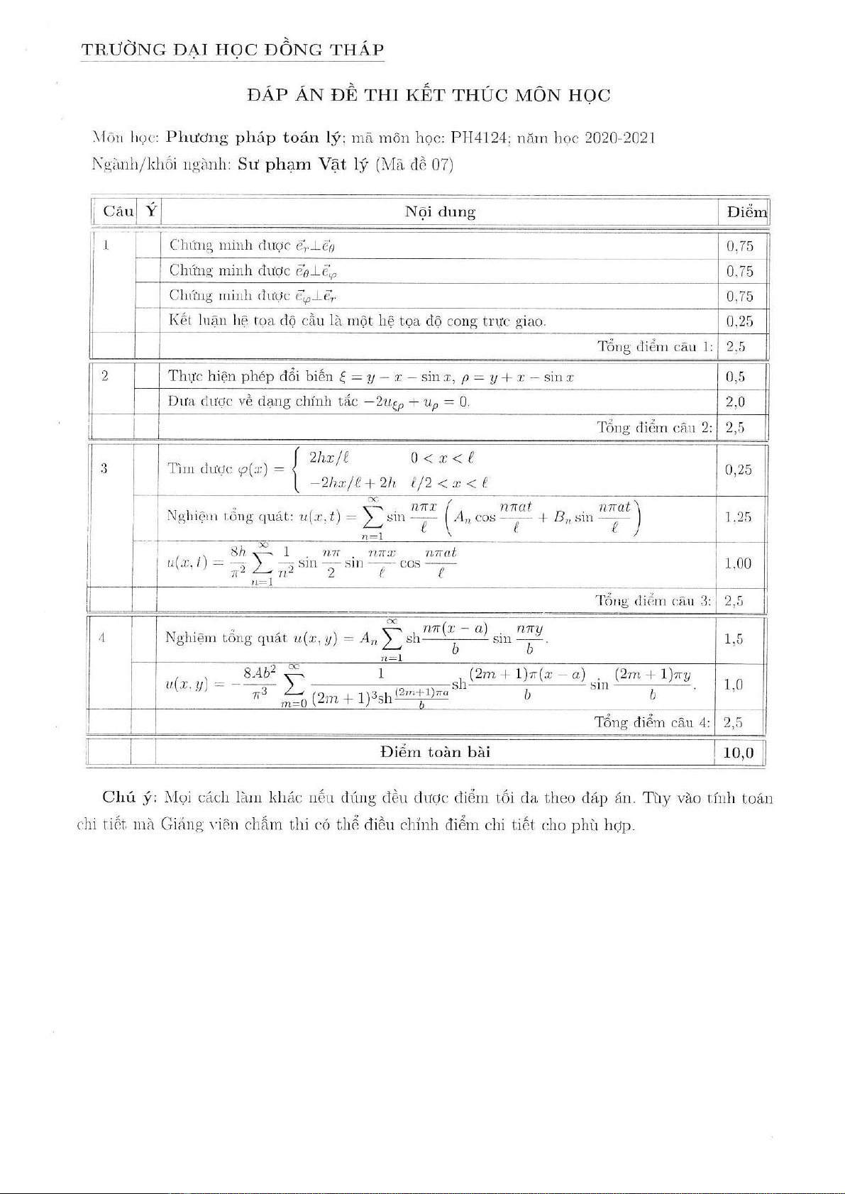 Đề thi kết thúc học phần học kì 1 môn Phương pháp Toán Lý năm 2020-2021 có đáp án - Trường ĐH Đồng Tháp