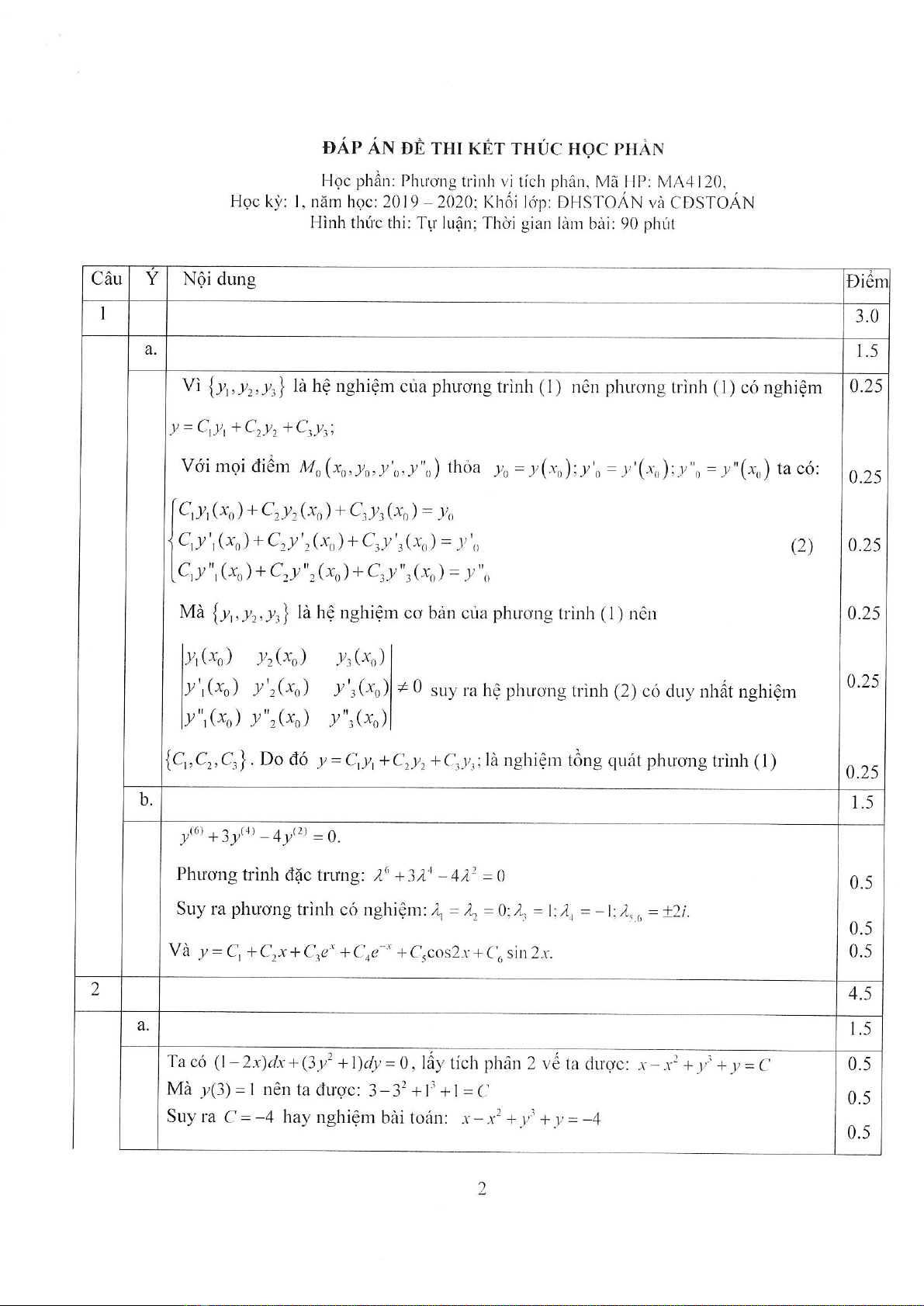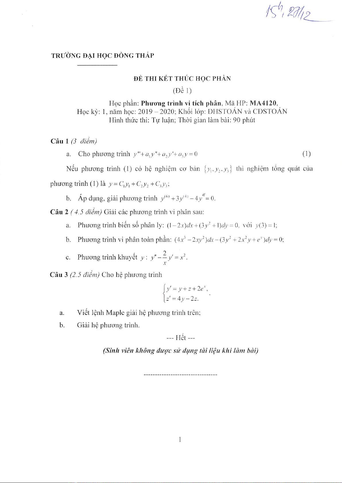 Đề thi kết thúc học phần học kì 1 môn Phương pháp vi tích phân năm 2019-2020 có đáp án - Trường ĐH Đồng Tháp