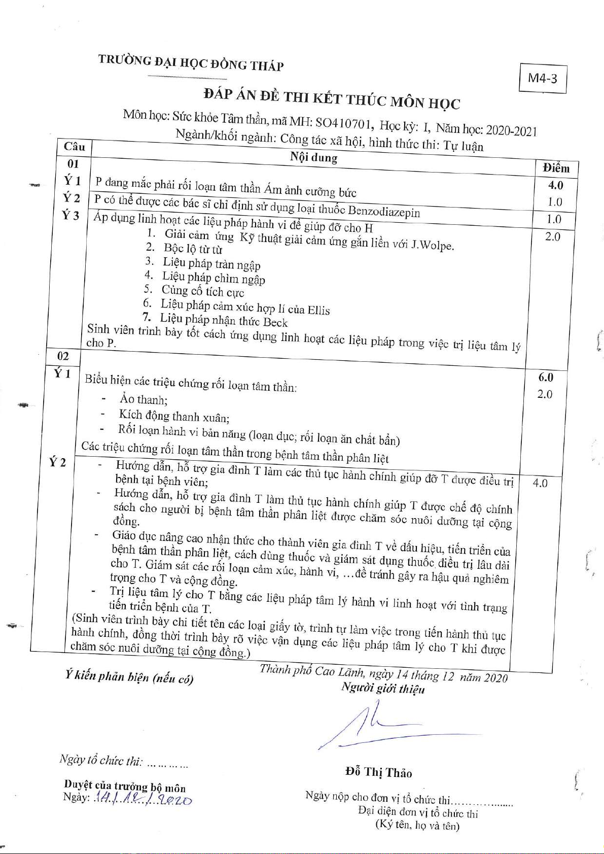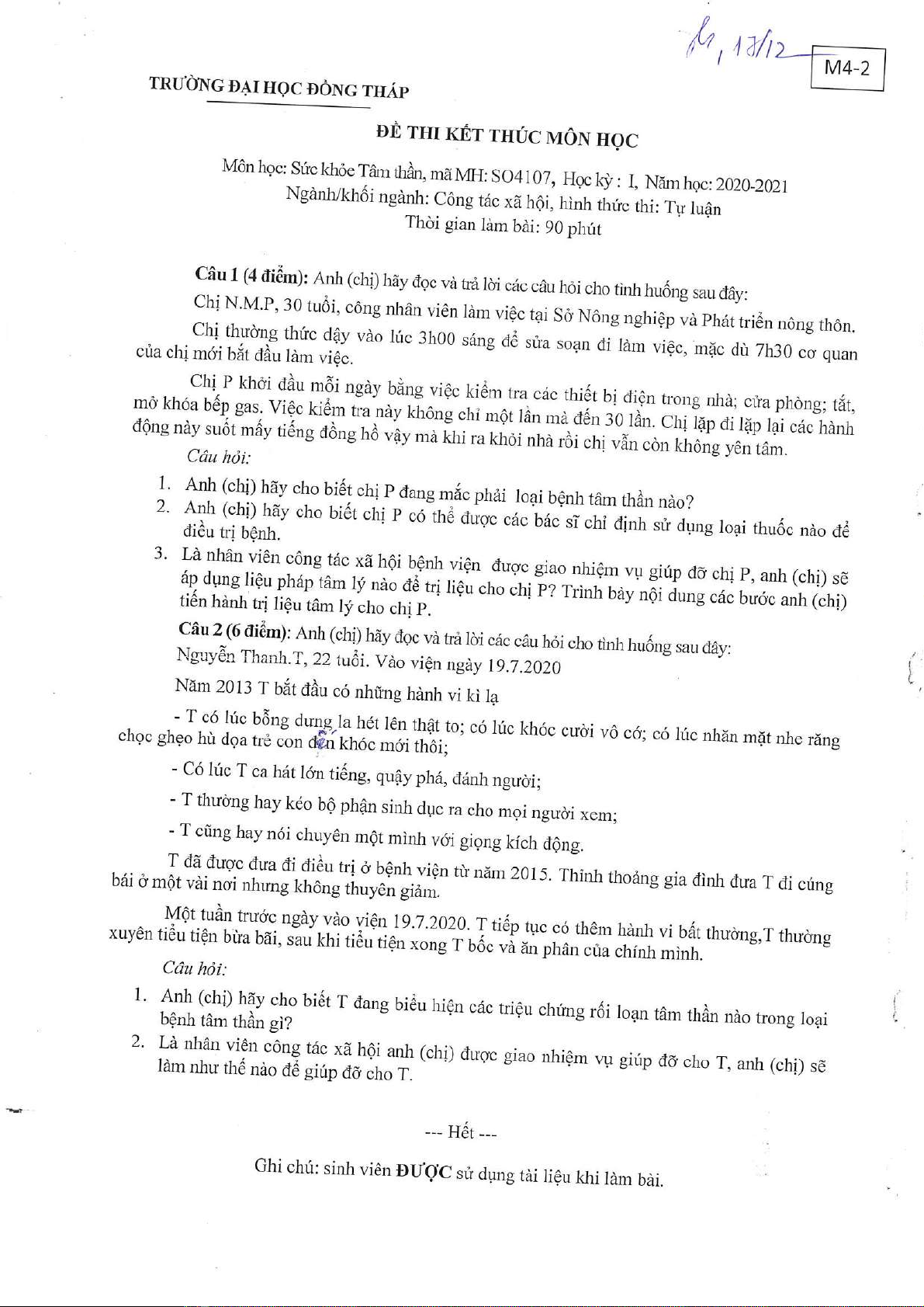 Đề thi kết thúc học phần học kì 1 môn Sức khỏe Tâm thần năm 2020-2021 có đáp án - Trường ĐH Đồng Tháp