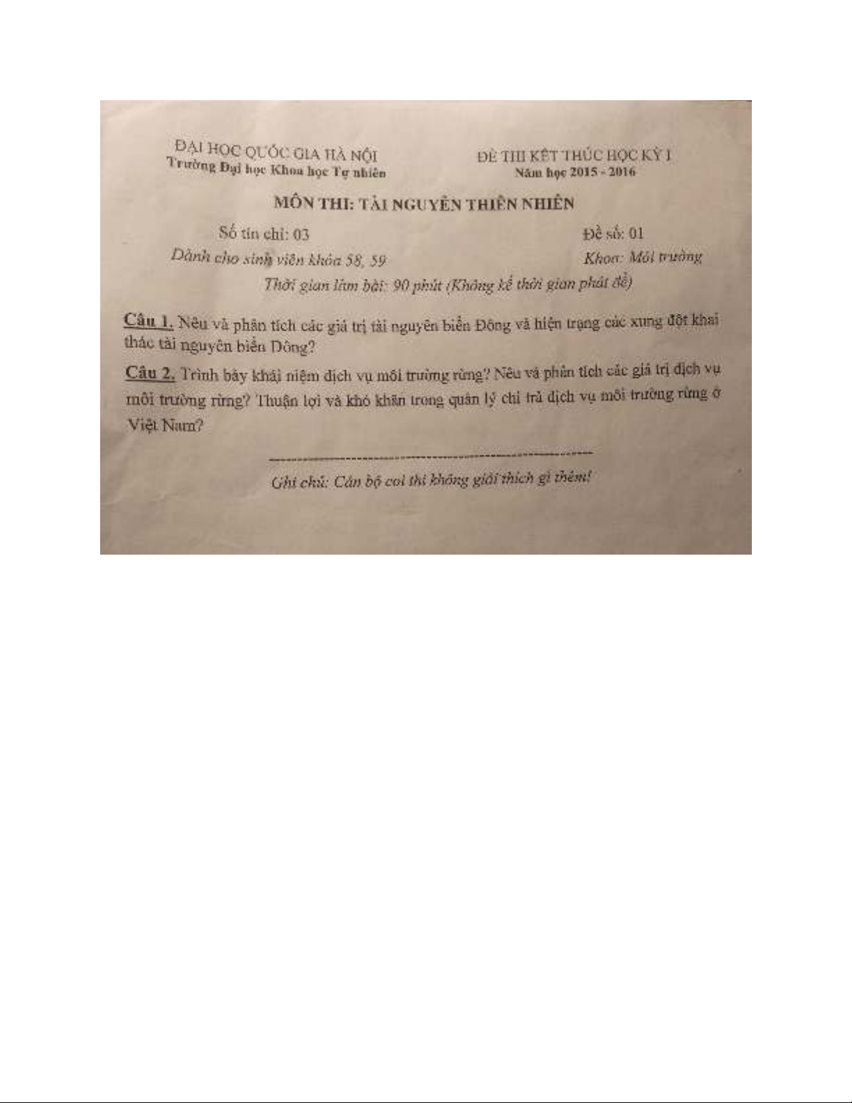 Đề thi kết thúc học kỳ I năm học 2015-2016 môn Tài nguyên thiên nhiên - ĐH Khoa học Tự nhiên