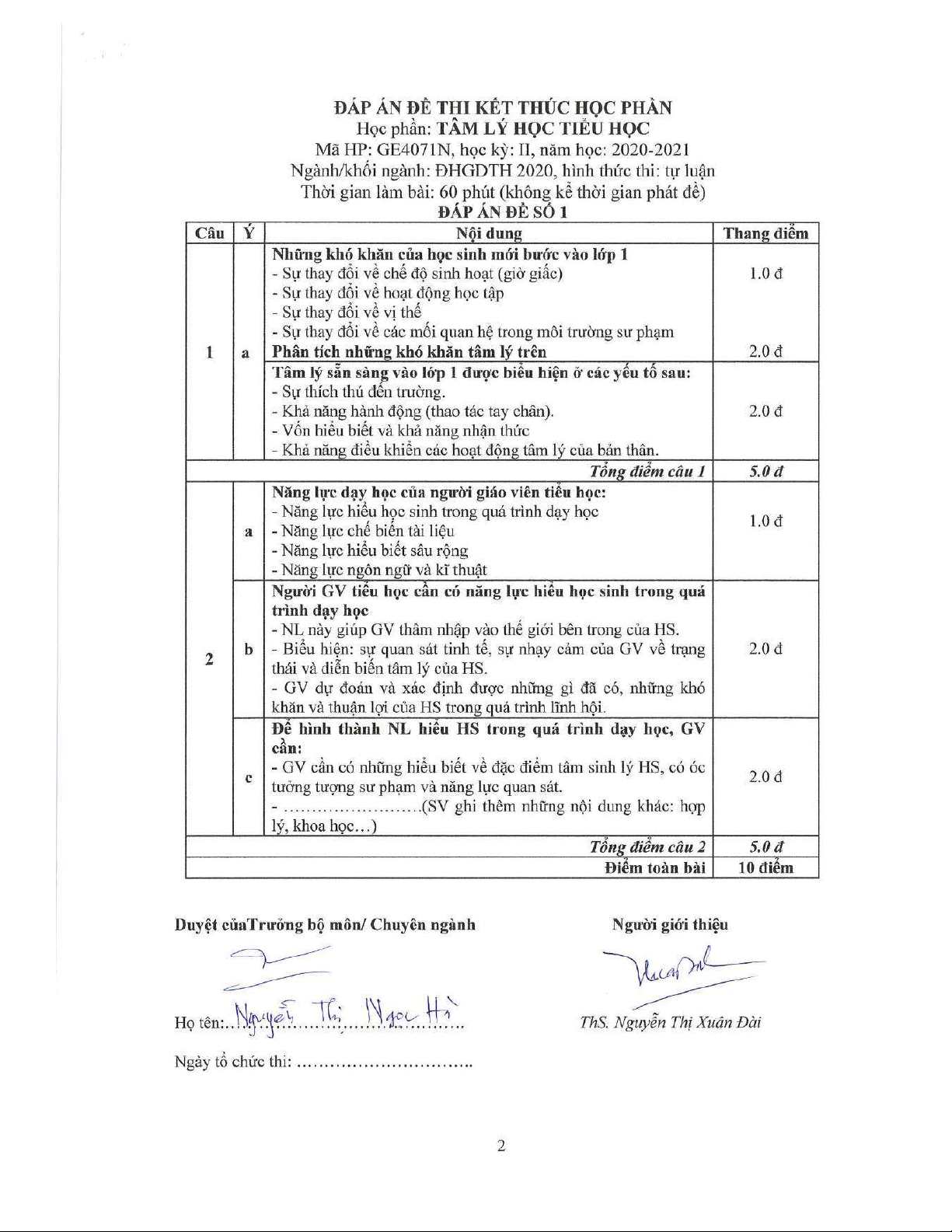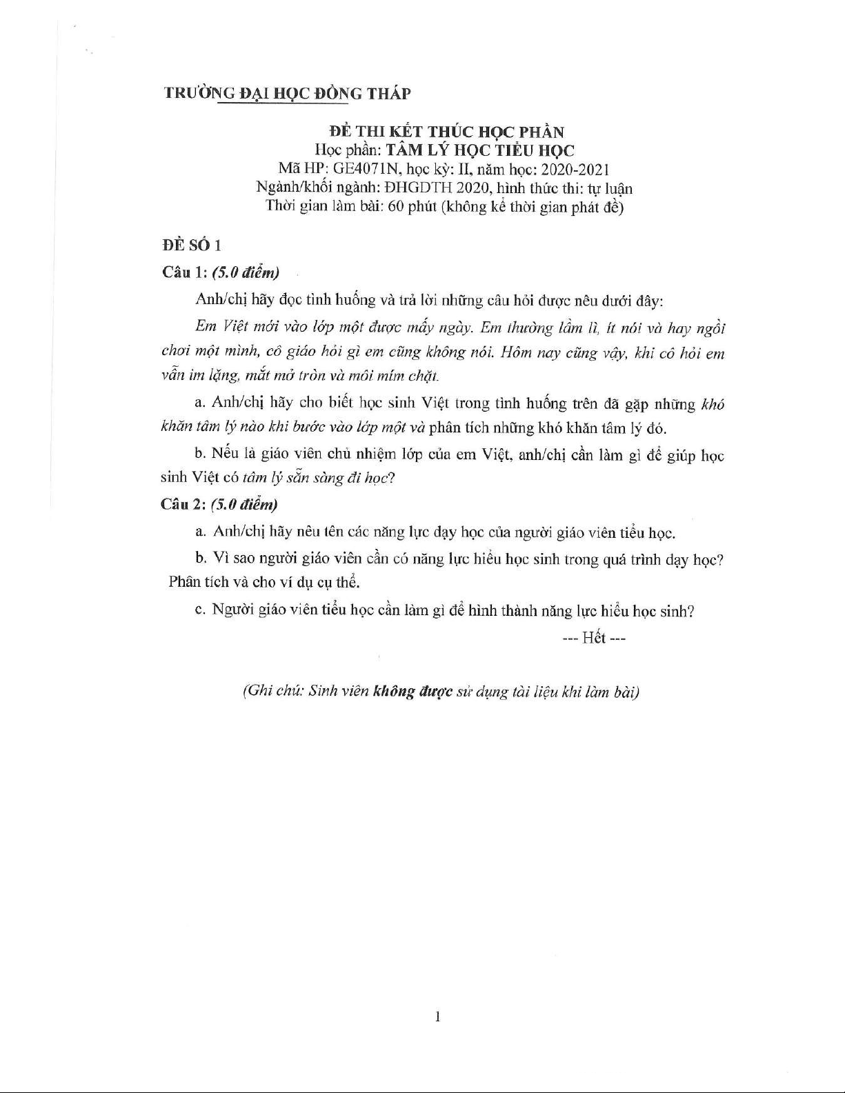 Đề thi kết thúc học phần học kì 2 môn Tâm lý học tiểu học năm 2020-2021 có đáp án - Trường ĐH Đồng Tháp