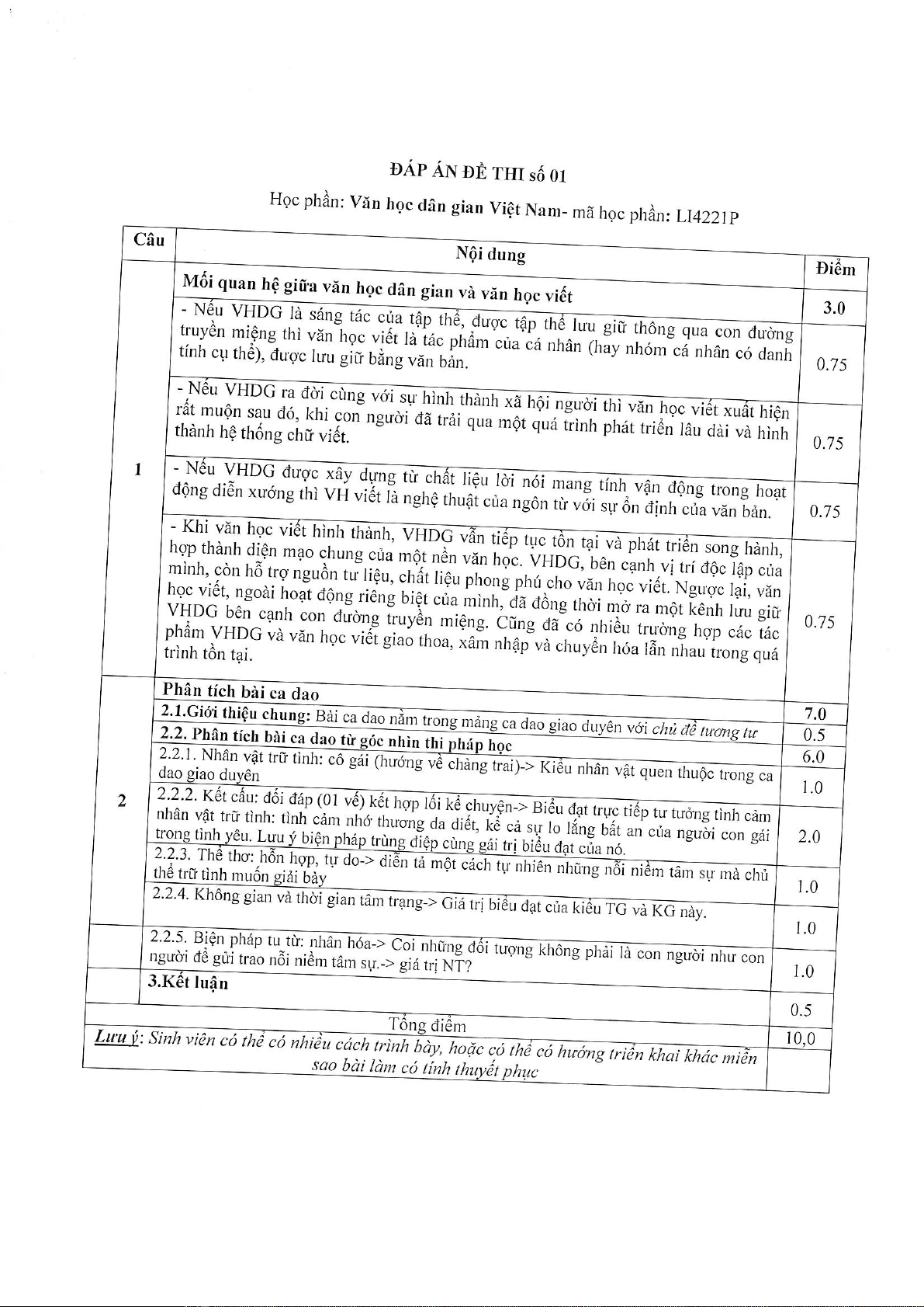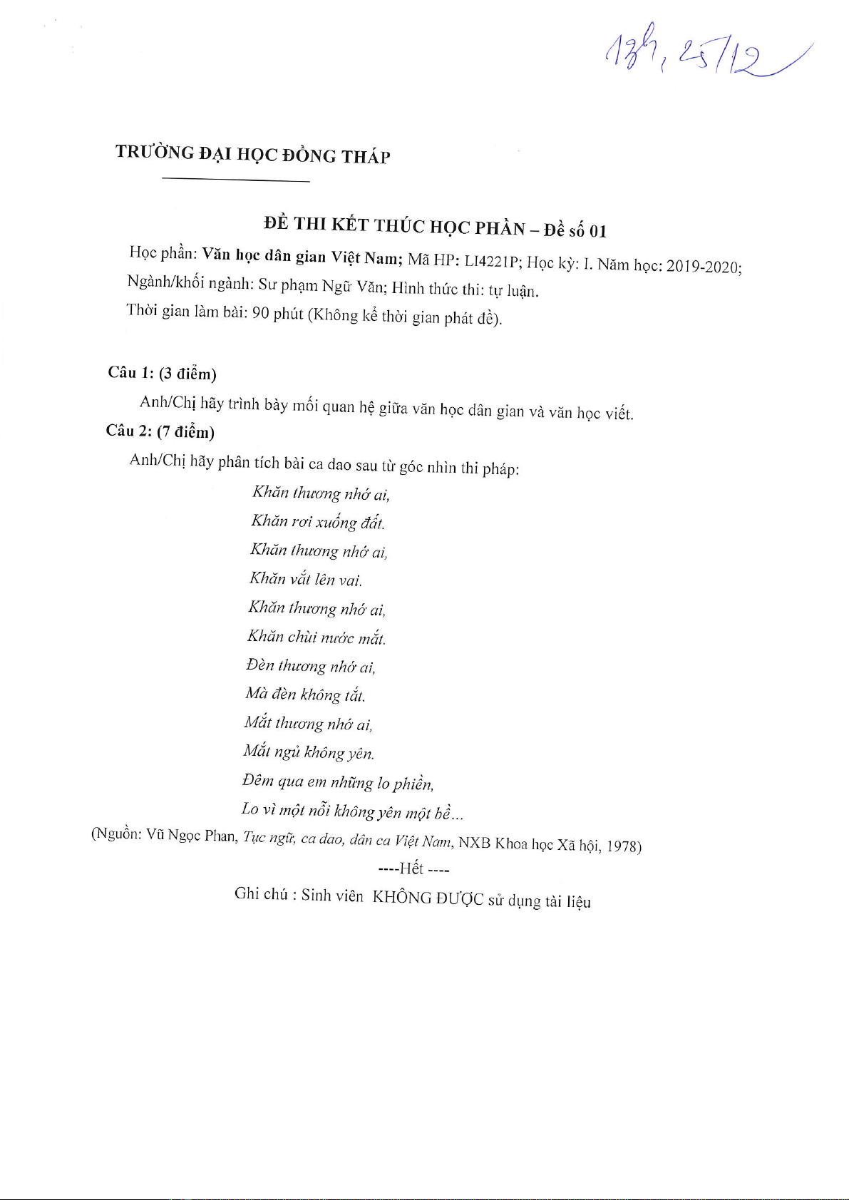 Đề thi kết thúc học phần học kì 1 môn Văn học dân gian Việt Nam năm 2019-2020 có đáp án - Trường ĐH Đồng Tháp