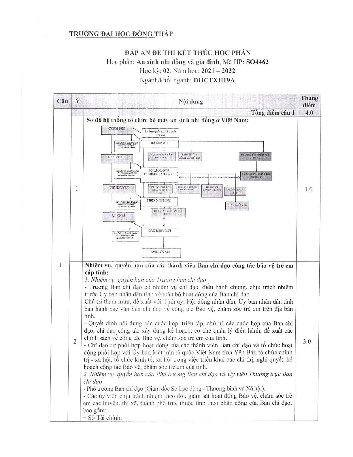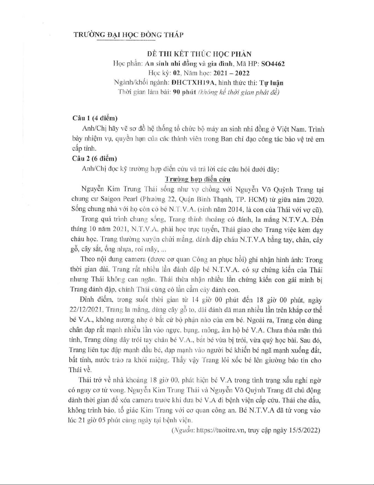 Đề thi kết thúc học phần học kì 2 môn An sinh nhi đồng và gia đình năm 2021-2022 có đáp án - Trường ĐH Đồng Tháp