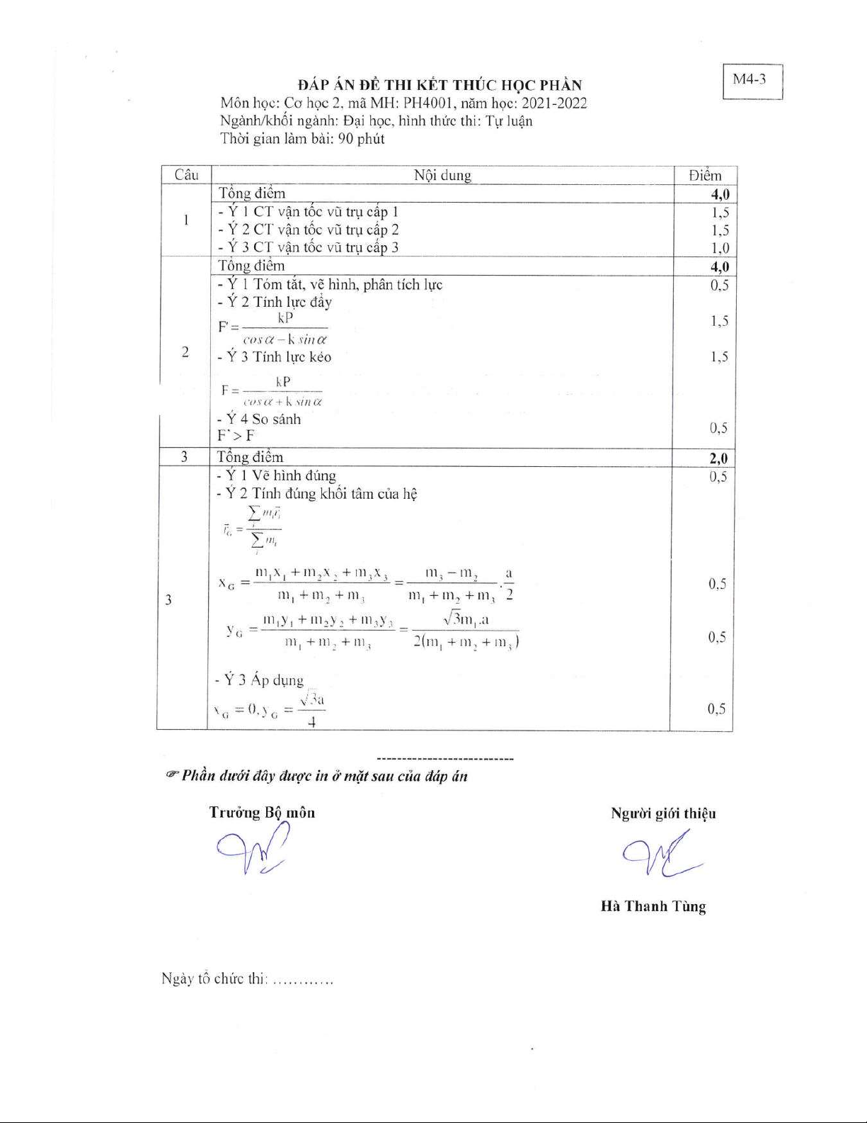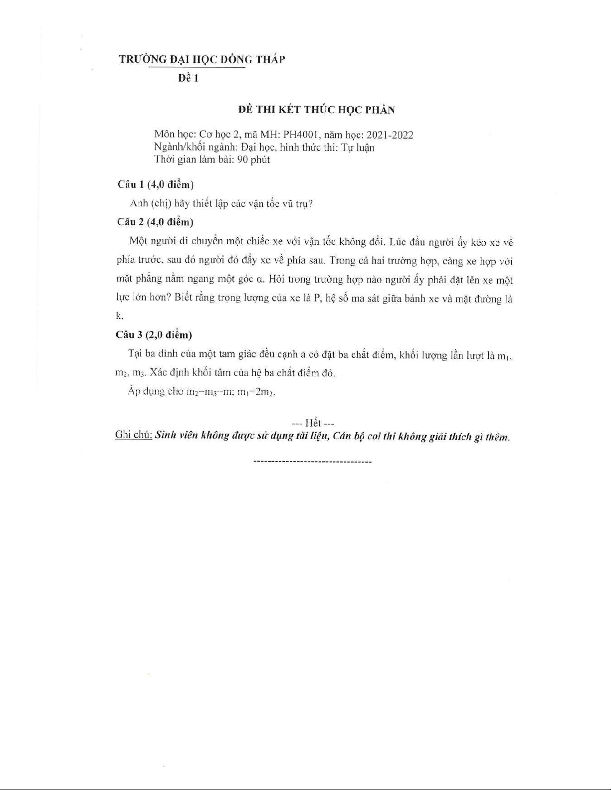 Đề thi kết thúc học phần học kì 2 môn Cơ học 2 năm 2021-2022 có đáp án - Trường ĐH Đồng Tháp