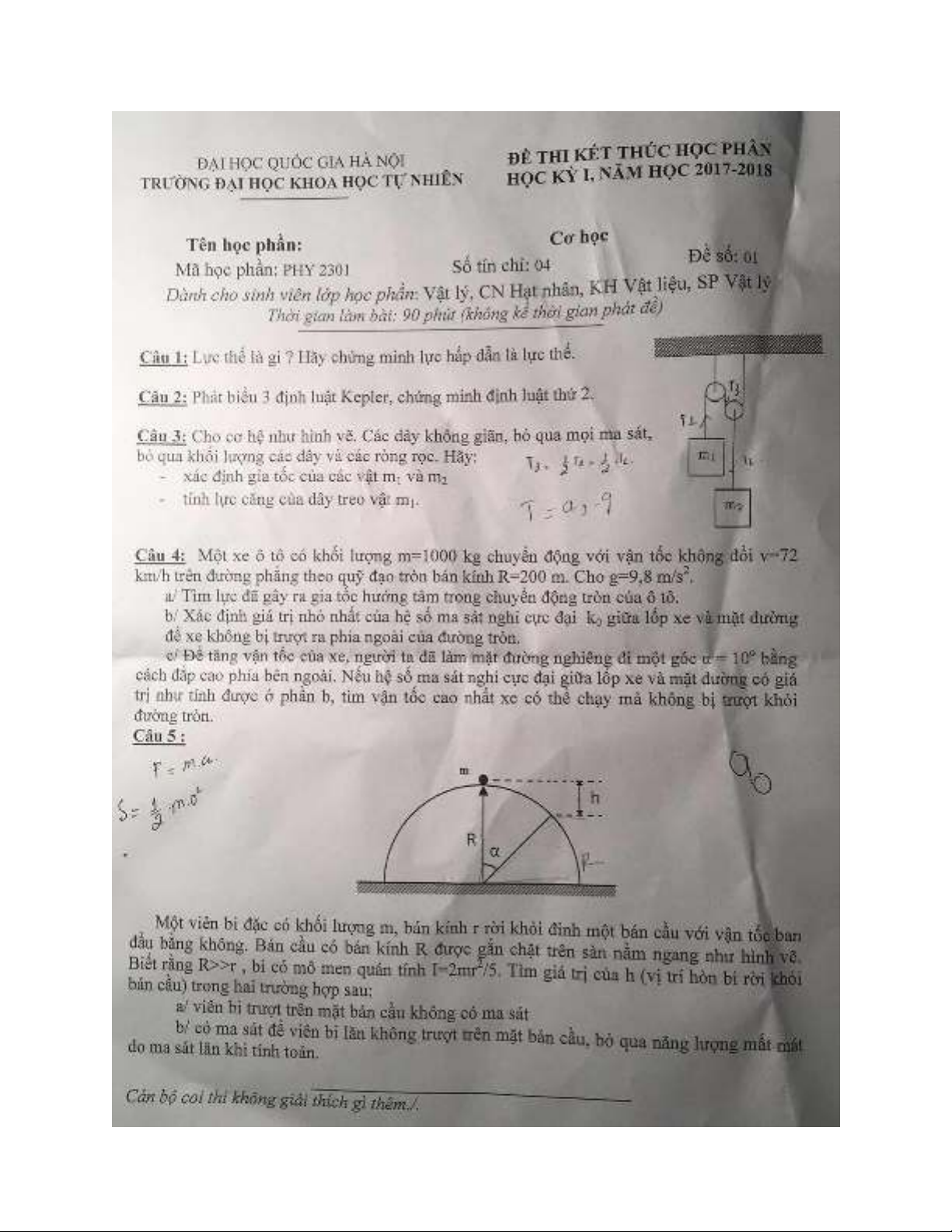 Đề thi kết thúc học phần học kỳ I năm học 2017-2018 môn Cơ học - ĐH Khoa học Tự nhiên (Đề số 1)