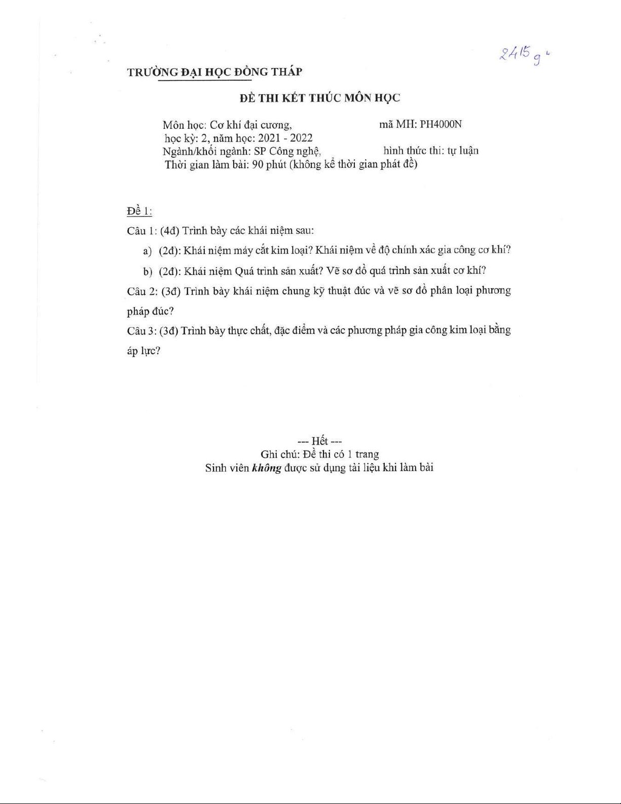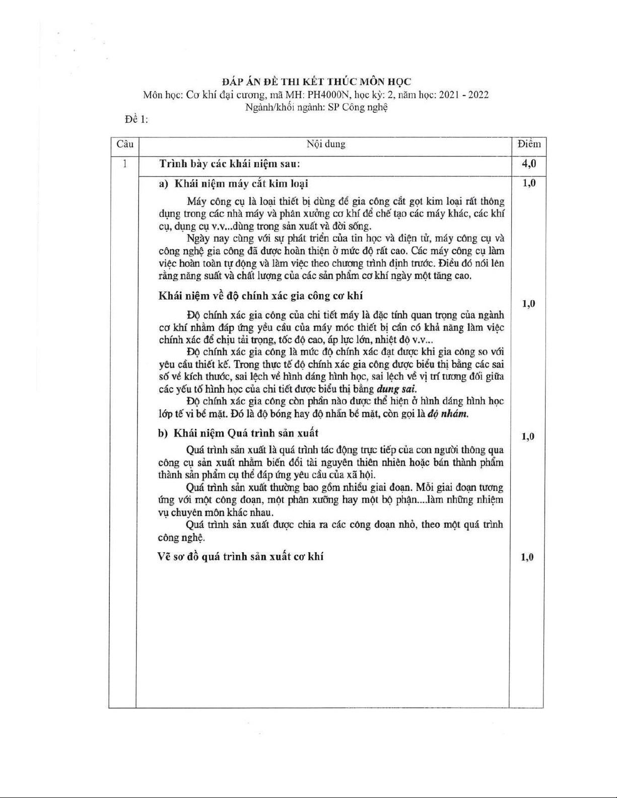 Đề thi kết thúc học phần học kì 2 môn Cơ khí đại cương năm 2021-2022 có đáp án - Trường ĐH Đồng Tháp