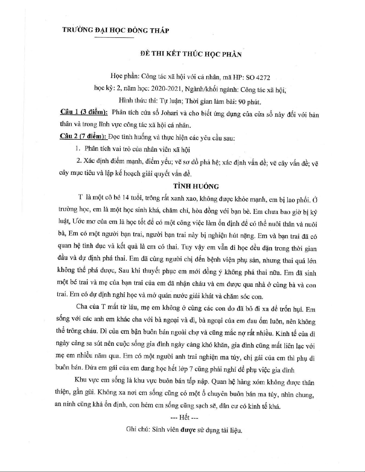 Đề thi kết thúc học phần học kì 2 môn Công tác xã hội với cá nhân năm 2020-2021 có đáp án - Trường ĐH Đồng Tháp